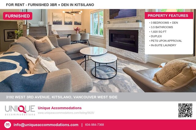 This furnished duplex in Kitsilano, Vancouver West Side offers 3 bedroom, 3.5 bathroom plus a den, and 1820 square feet of living space. Amenities include air conditioning, in-suite laundry. This property is pet-friendly. Available August 1, 2026. Monthly rent is $9,500. Located at 3192 West 3rd Avenue, Vancouver West Side. Contact Unique Accommodations at 604-984-7368 to arrange a viewing.