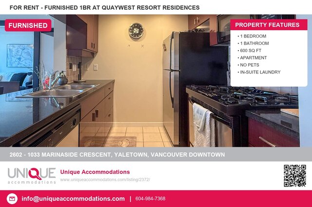 This furnished condo in Yaletown, Vancouver Downtown offers 1 bedroom, 1 bathroom, and 600 square feet of living space. Located in QuayWest Resort Residences. Amenities include parking, in-suite laundry. Monthly rent is $3,350. Located at 2602 - 1033 Marinaside Crescent, Vancouver Downtown. Contact Unique Accommodations at 604-984-7368 to arrange a viewing.