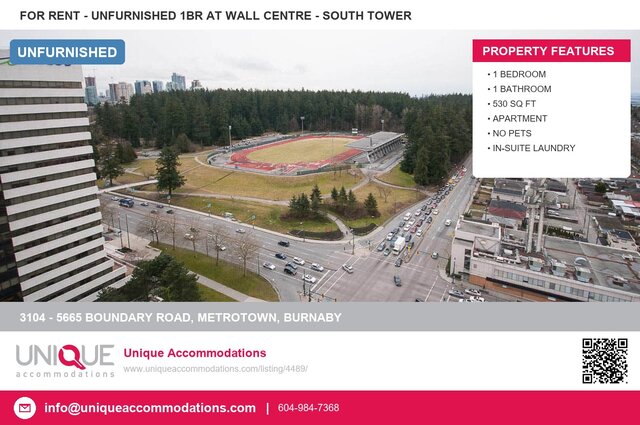 This unfurnished condo in Metrotown, Burnaby offers 1 bedroom, 1 bathroom, and 530 square feet of living space. Located in Wall Centre - South Tower. Amenities include a balcony, parking, in-suite laundry. Available June 1, 2026. Monthly rent is $2,350. Located at 3104 - 5665 Boundary Road, Burnaby. Contact Unique Accommodations at 604-984-7368 to arrange a viewing.