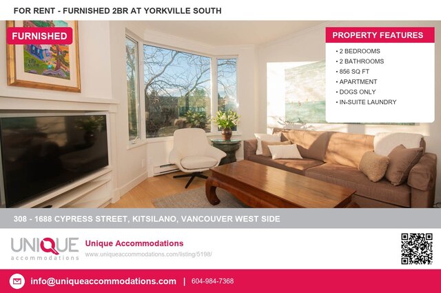 This furnished condo in Kitsilano, Vancouver West Side offers 2 bedroom, 2 bathroom, and 856 square feet of living space. Located in Yorkville South. Amenities include parking, in-suite laundry. This property is pet-friendly. Available September 1, 2026. Monthly rent is $3,650. Located at 308 - 1688 Cypress Street, Vancouver West Side. Contact Unique Accommodations at 604-984-7368 to arrange a viewing.