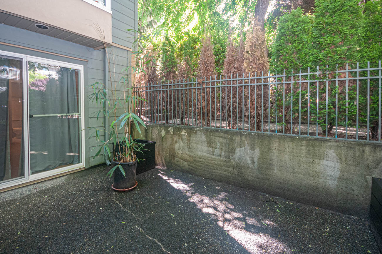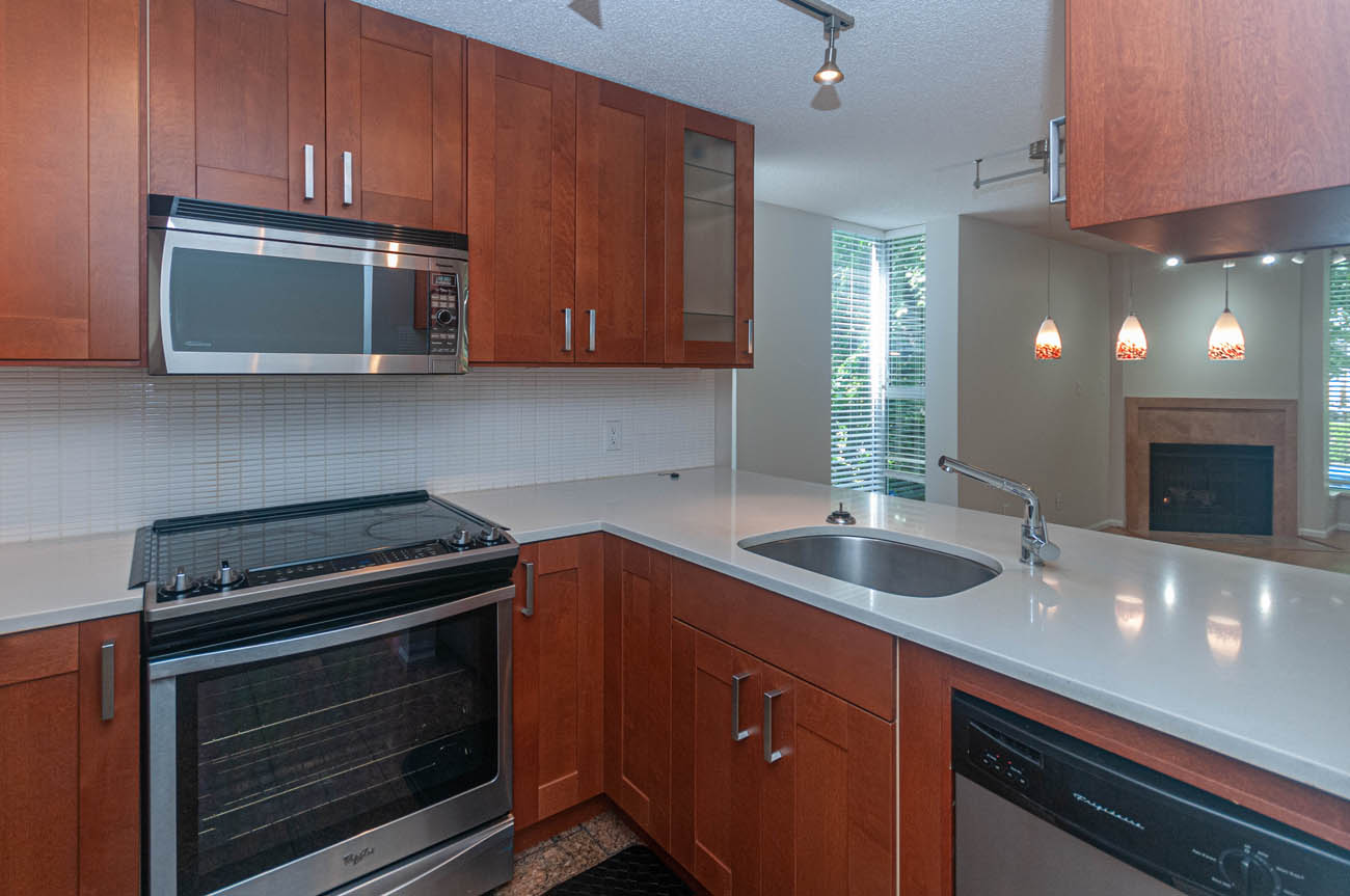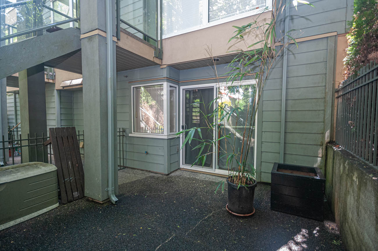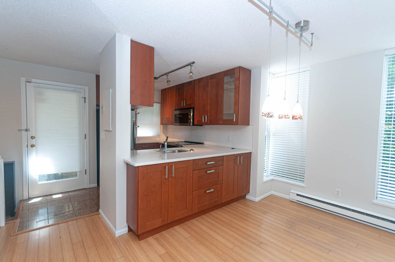 End unit townhouse with bamboo floors and updated kitchen with new tile backsplash, cabinets and stainless steel appliances. Quarts stone counter top with built in hood fan and microwave. Gas fire place, in suite laundry. Large ground level patio. Only 5 blocks from South Granville and West Broadway and 5 minutes to VGH and Children's Hospital.