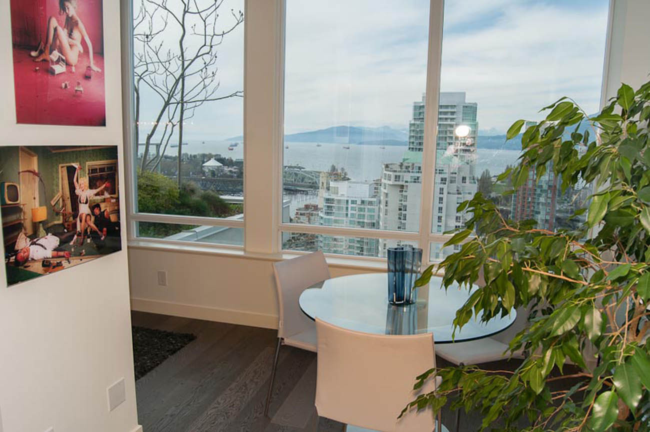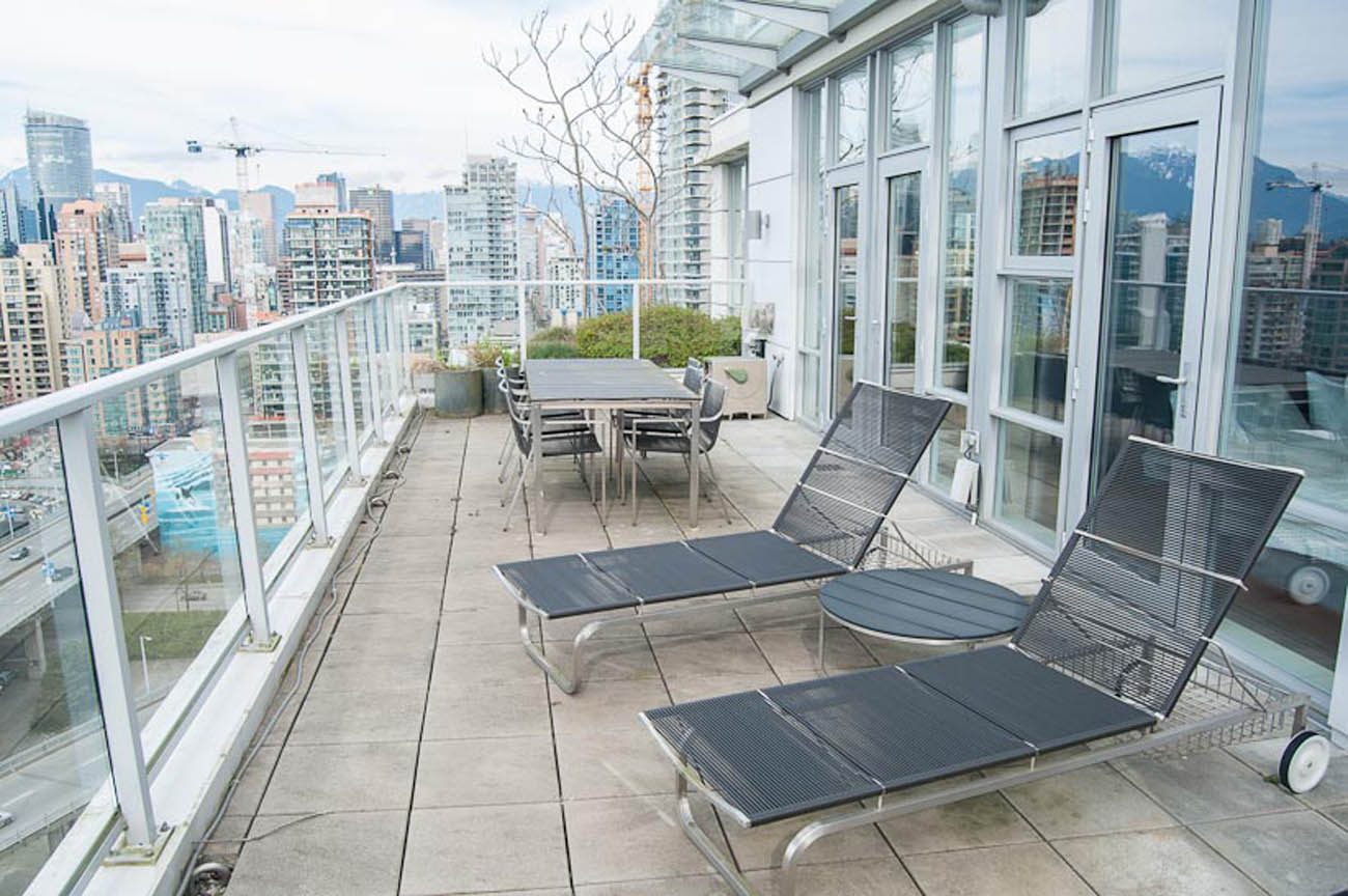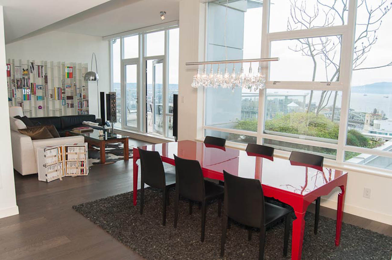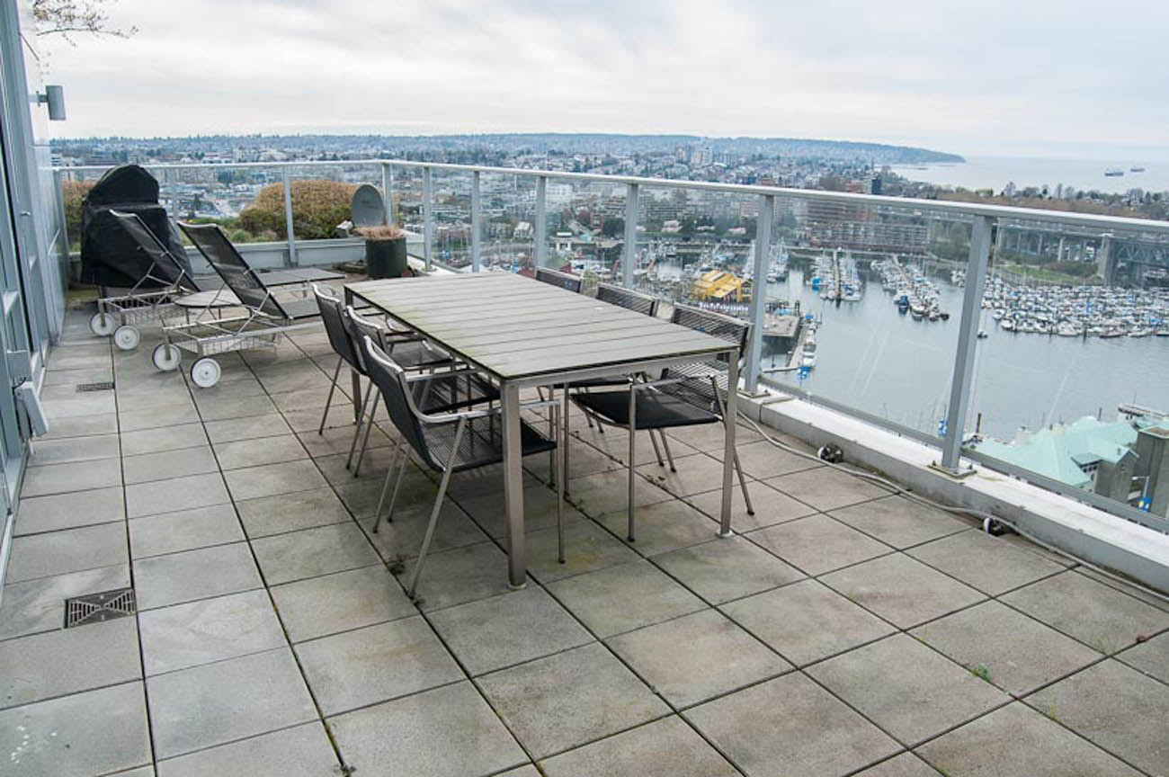Stunning penthouse in desirable waterfront False Creek location. Spacious 2 bedroom unit with fantastic layout featuring 180 degree unobstructed views of English Bay, UBC and mountains. Many features including gourmet chef's kitchen with top of the line appliances, oak floors, steam shower, over height ceilings, A/C, motorized Lutron sunshades and black-out blinds in bedrooms. Building amenities include concierge, indoor pool, hot tub, steam room, gym, meeting/party room and theatre. 1 parking stall included.