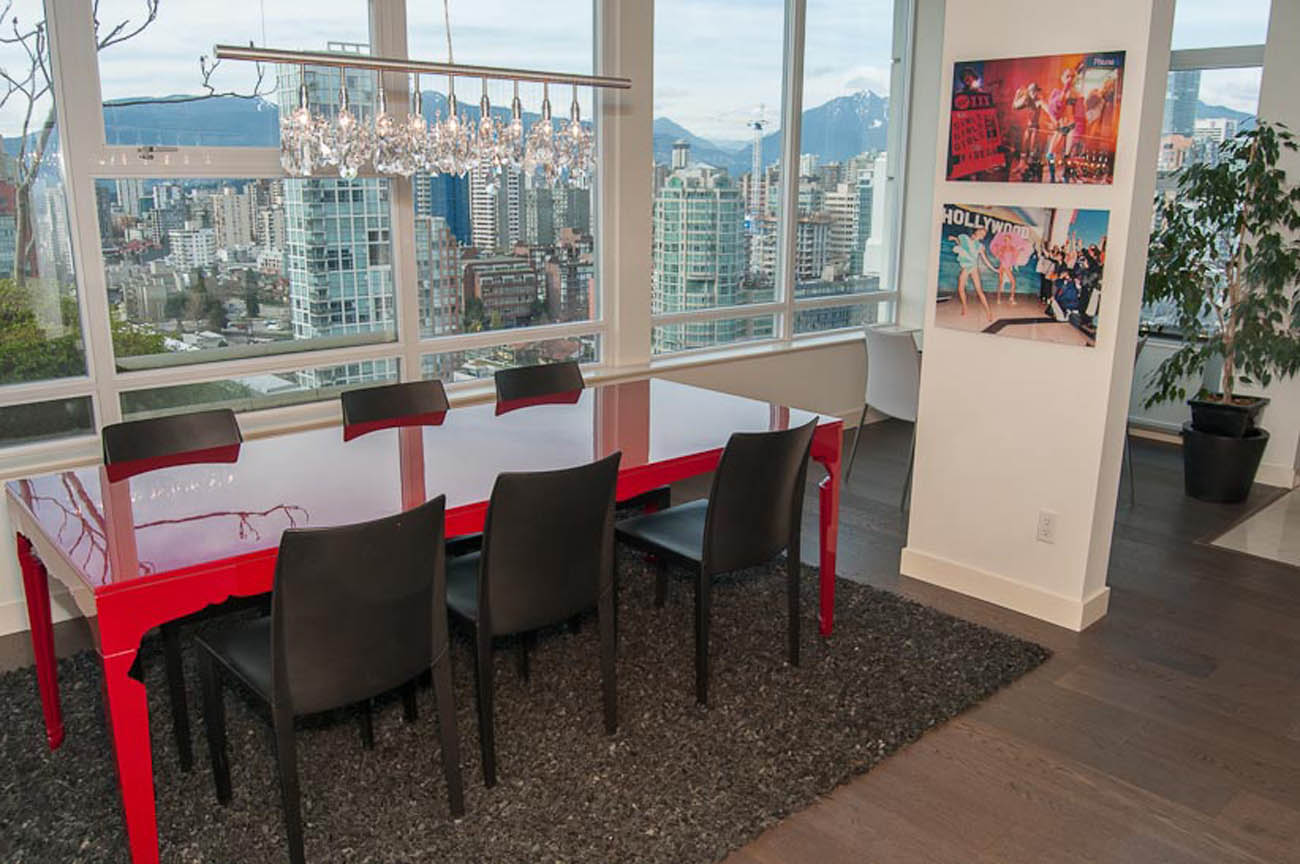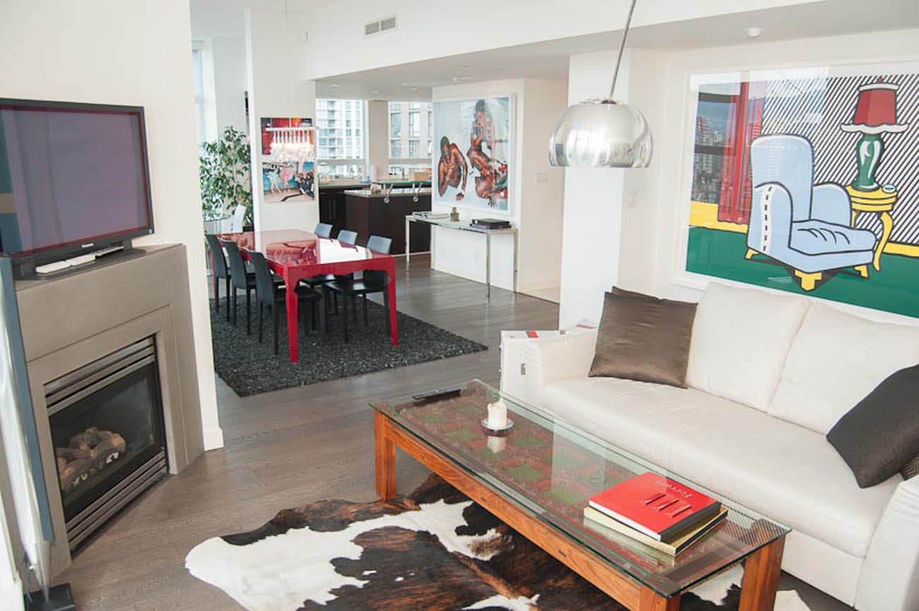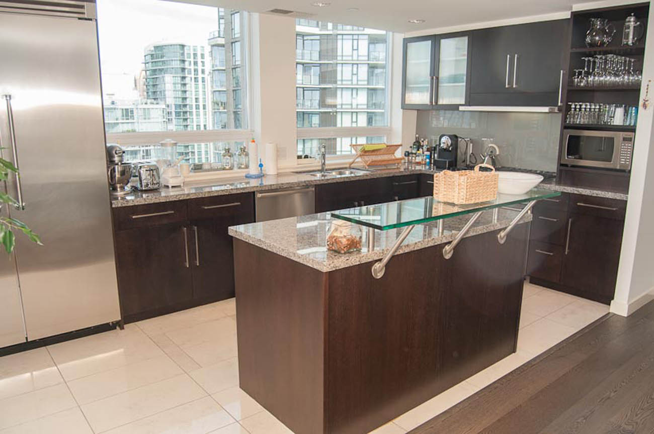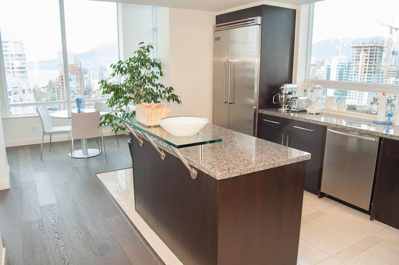 Stunning penthouse in desirable waterfront False Creek location. Spacious 2 bedroom unit with fantastic layout featuring 180 degree unobstructed views of English Bay, UBC and mountains. Many features including gourmet chef's kitchen with top of the line appliances, oak floors, steam shower, over height ceilings, A/C, motorized Lutron sunshades and black-out blinds in bedrooms. Building amenities include concierge, indoor pool, hot tub, steam room, gym, meeting/party room and theatre. 1 parking stall included.