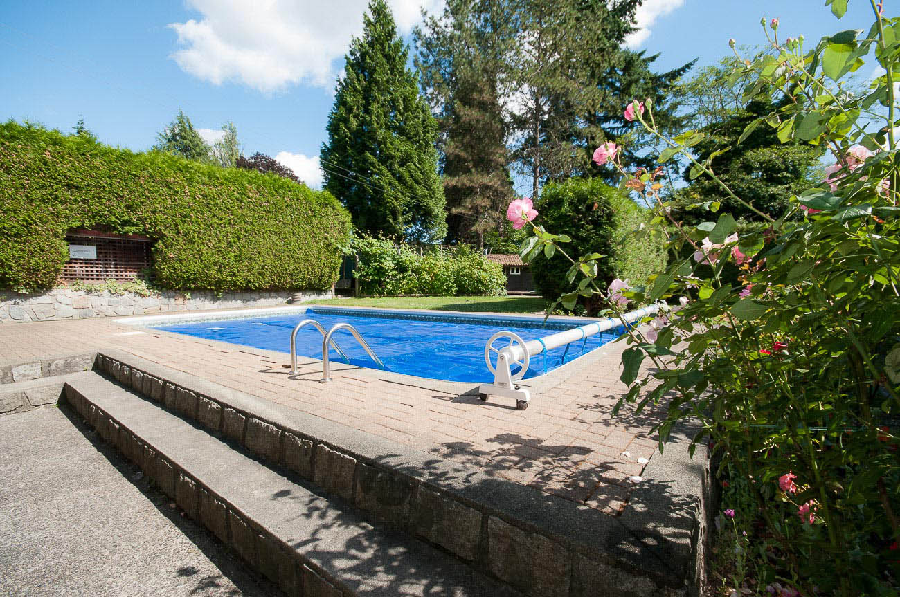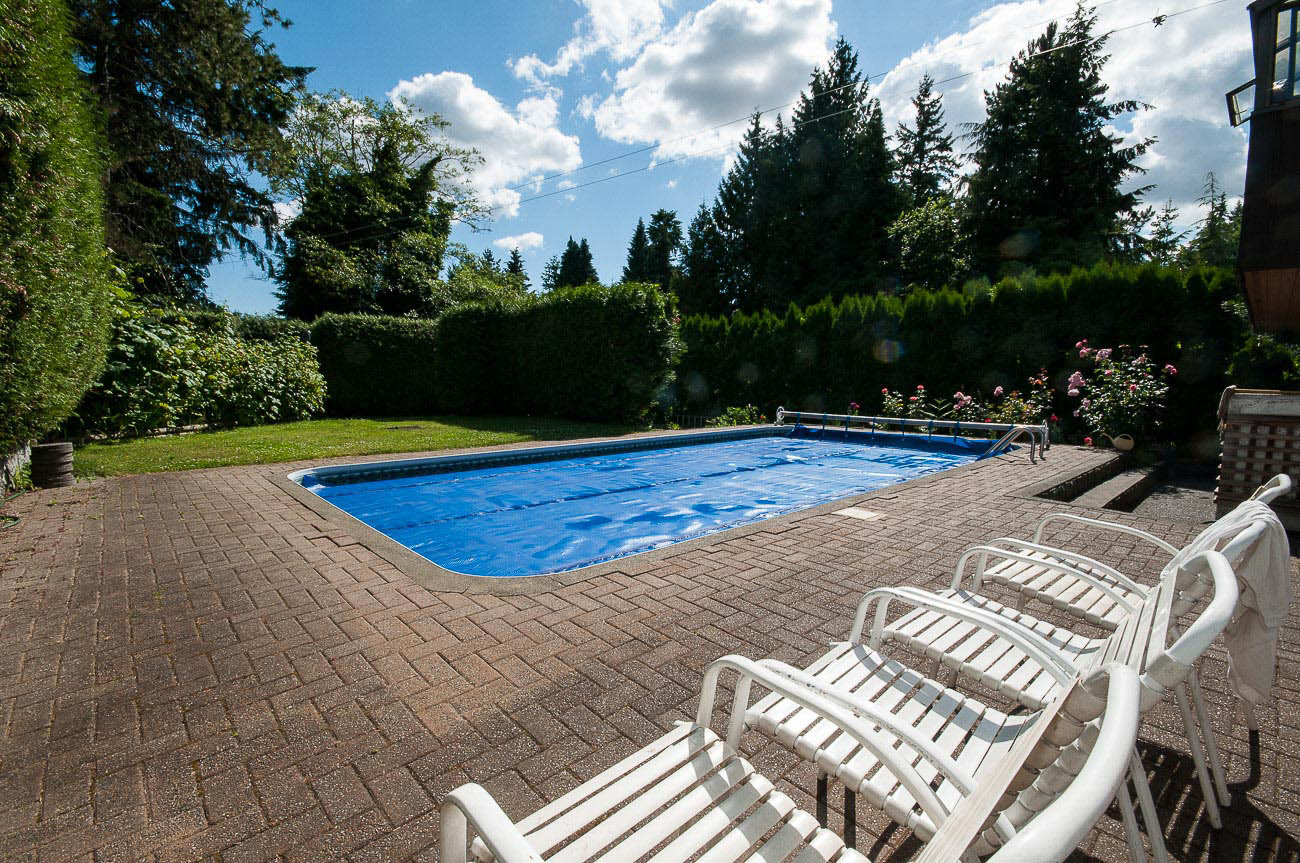 New carpet and paint. Lovely custom built post and beam home with practical horseshoe driveway and level portico covered parking by your front door. This well maintained home offers generous sized rooms & recent updates including refinished oak flooring on the main and updated kitchen with stainless appliances. Lower level features separate suite, perfect for in-laws or nanny. Located on a lovely, private, oversized south facing lot complete with in-ground heated/filtered liner pool and rarely available lane access to a double carport. Family friendly neighbourhood, within walking distance to schools and recreation.
