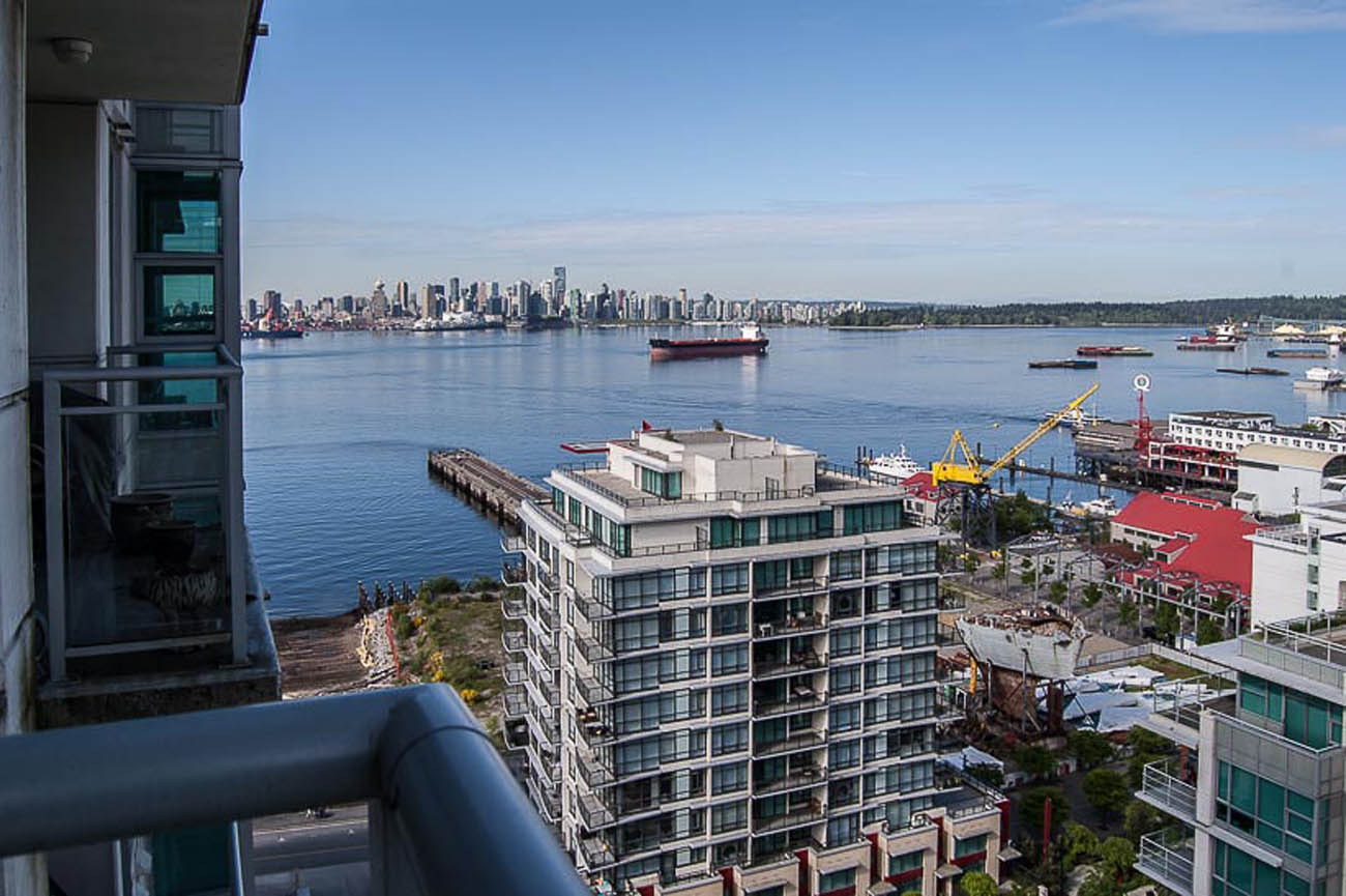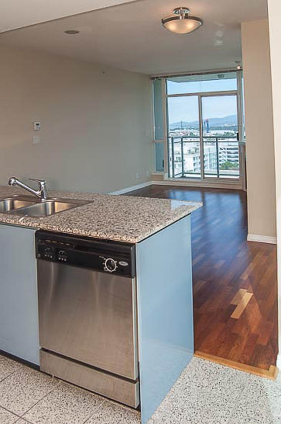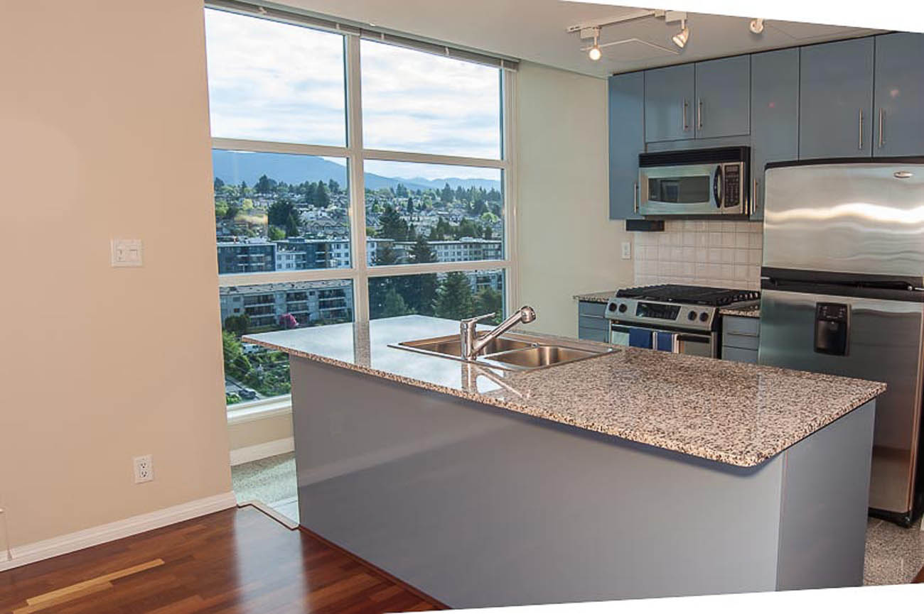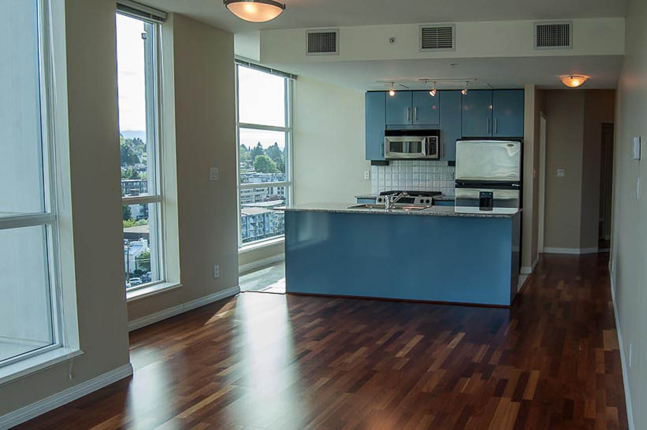 Bright and spacious 2 bedroom 2 bath unit featuring open layout, rich hardwood floors, kitchen with granite counters, large island, stainless steel appliances including gas cooktop. Large master features ensuite and walk-in closet. In-suite washer/dryer and A/C. Corner unit with west facing balcony with city and mountain views, BBQ's allowed. Great location- just steps to the sea bus, shopping and dining. One parking stall and storage unit included. NO FREE ACCESS TO HOTEL AMENITIES. Membership options available at additional fee.