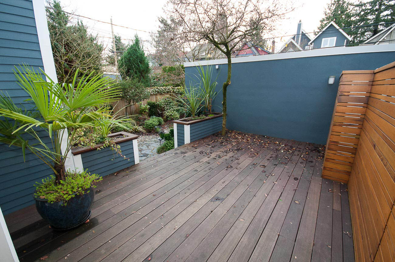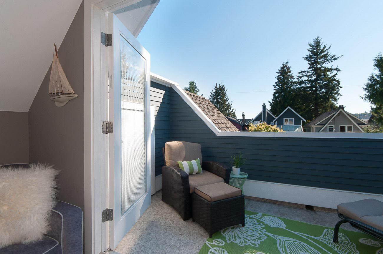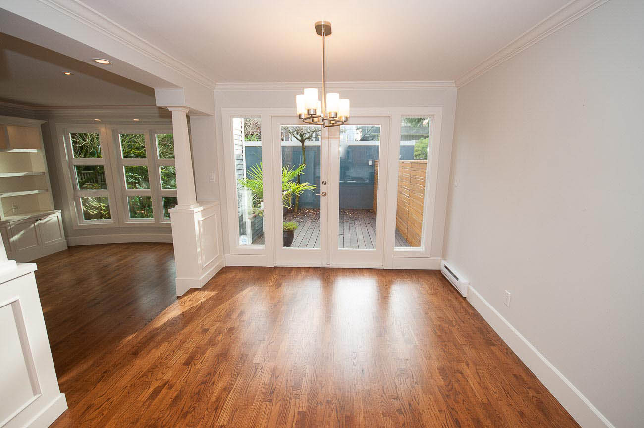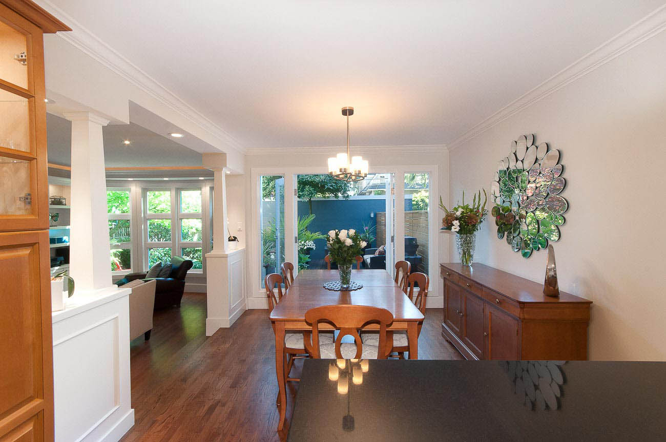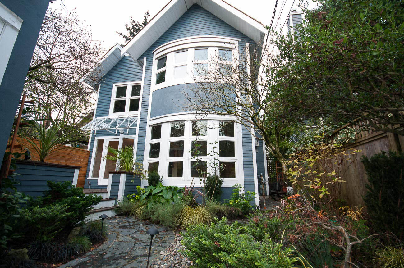 Architecturally designed, south-facing 1500 sf, 1/2 duplex on a quiet street, north of 4th avenue, with a beautiful sun-drenched back yard. This well laid out home offers a main level with an open kitchen, dining area and a sunken living room with a gas fireplace, all featuring gorgeous hardwood floors. The dining room has French doors that open up to a professionally designed garden and deck area, perfect for alfresco dining in the summer! The upper floor has two bedrooms, one of which is a master suite with its own ensuite bathroom. The top floor boasts a loft area with a private south-facing deck, making it a possible 3rd bedroom, den or home office. Renovations over the last few years enhance this meticulously maintained home, including new appliances, custom high end cabinetry and millwork, new paint in and out, new windows, new hardwood decking, landscape lighting and irrigation. The one car garage has an EV charging station and there is a shed for bike storage. There is lots of well-designed storage. Bayview Elementary and Kits high school catchments, all of this within a very short walk to Jericho Beach and Kitsilano's shops and cafes!