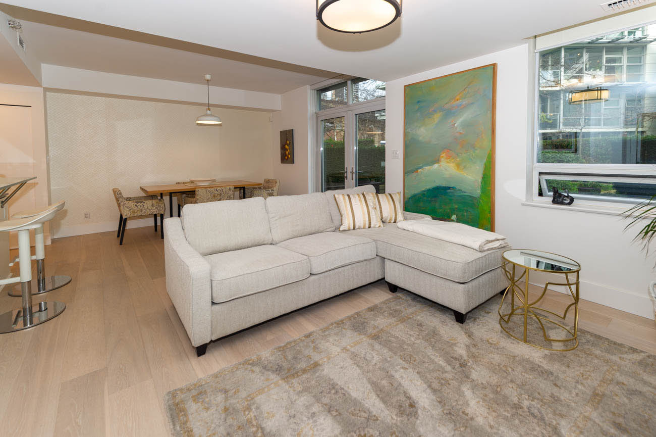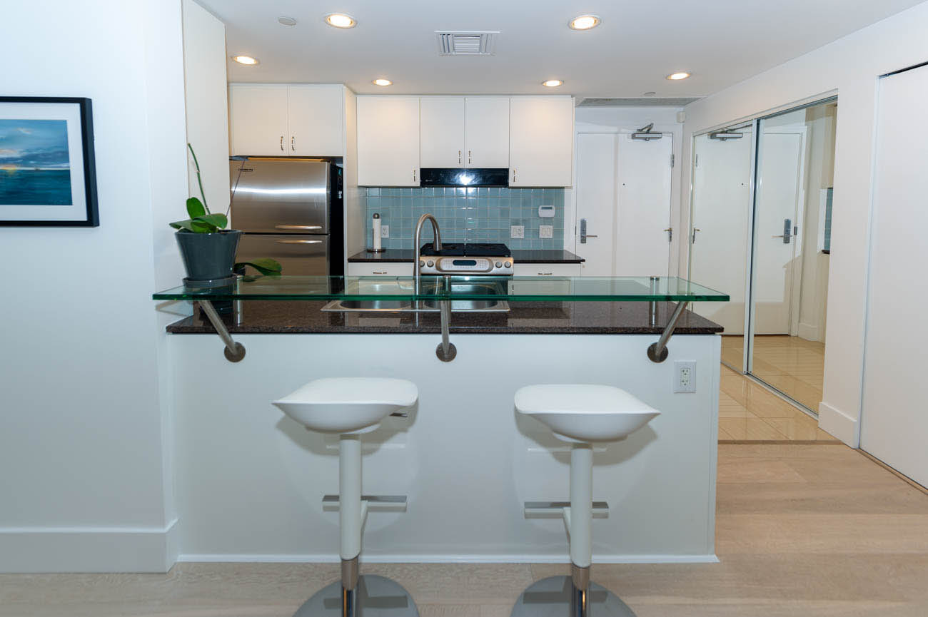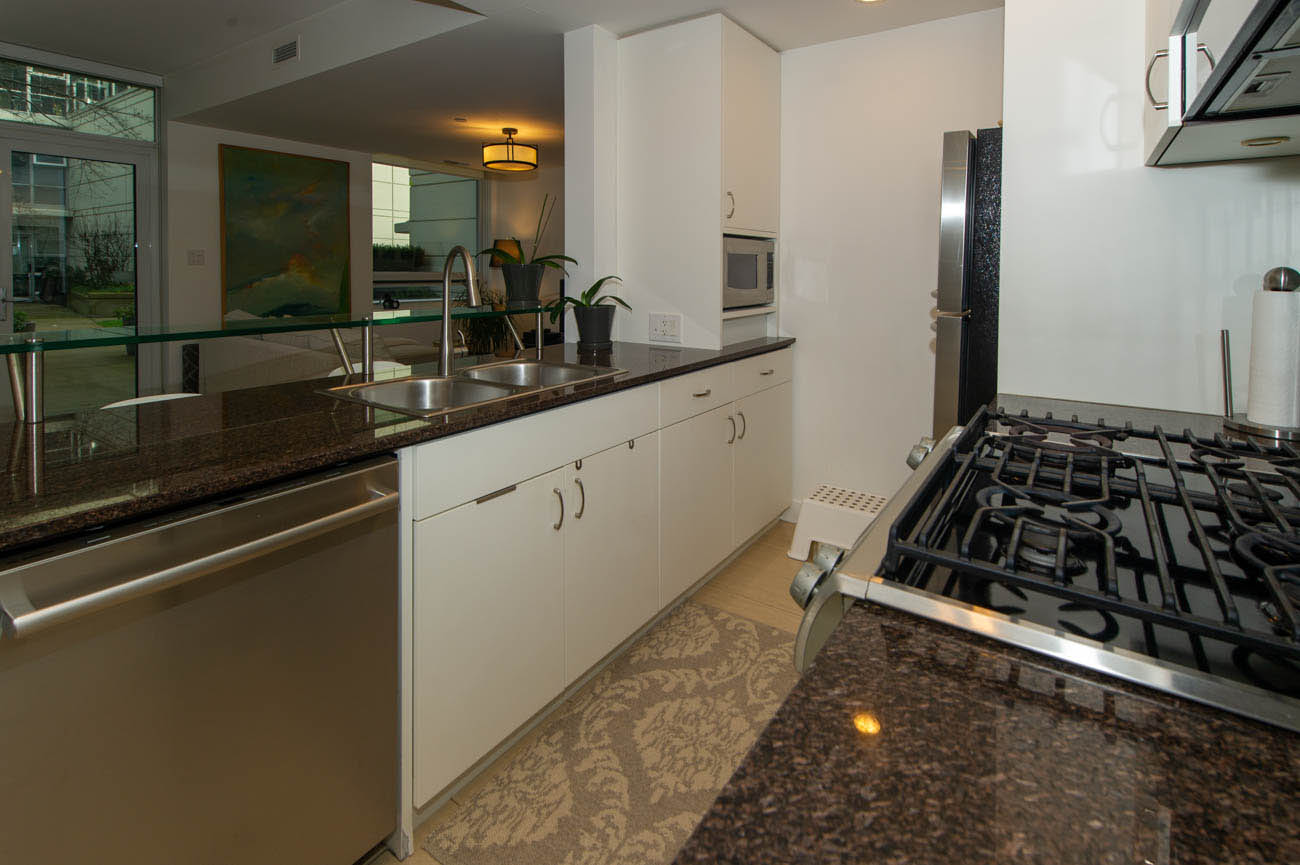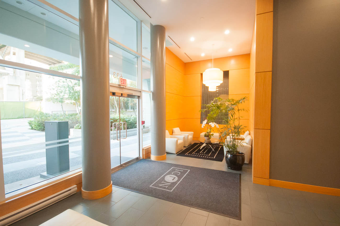 Stunning 1 bedroom plus den, newly renovated, WATERFRONT, home in the sought after ICON 2 building. This unique home features an open concept kitchen/living/dining layout, 9.5' ceilings, air conditioning, gas stove and a large private 225 NE facing patio with propane BBQ! The condo is equipped with engineered Oak flooring throughout, a built-in desk and shelves in den and smart organization in the storage space. ICON 2 offers concierge services, recreational facilities with exercise gym, indoor pool, sauna/steam room and party room. The location is across from George Wainborn Park near all the shops, restaurants, and services Yaletown has to offer. Parking stall available upon prior request. 3 MONTH MINIMUM.