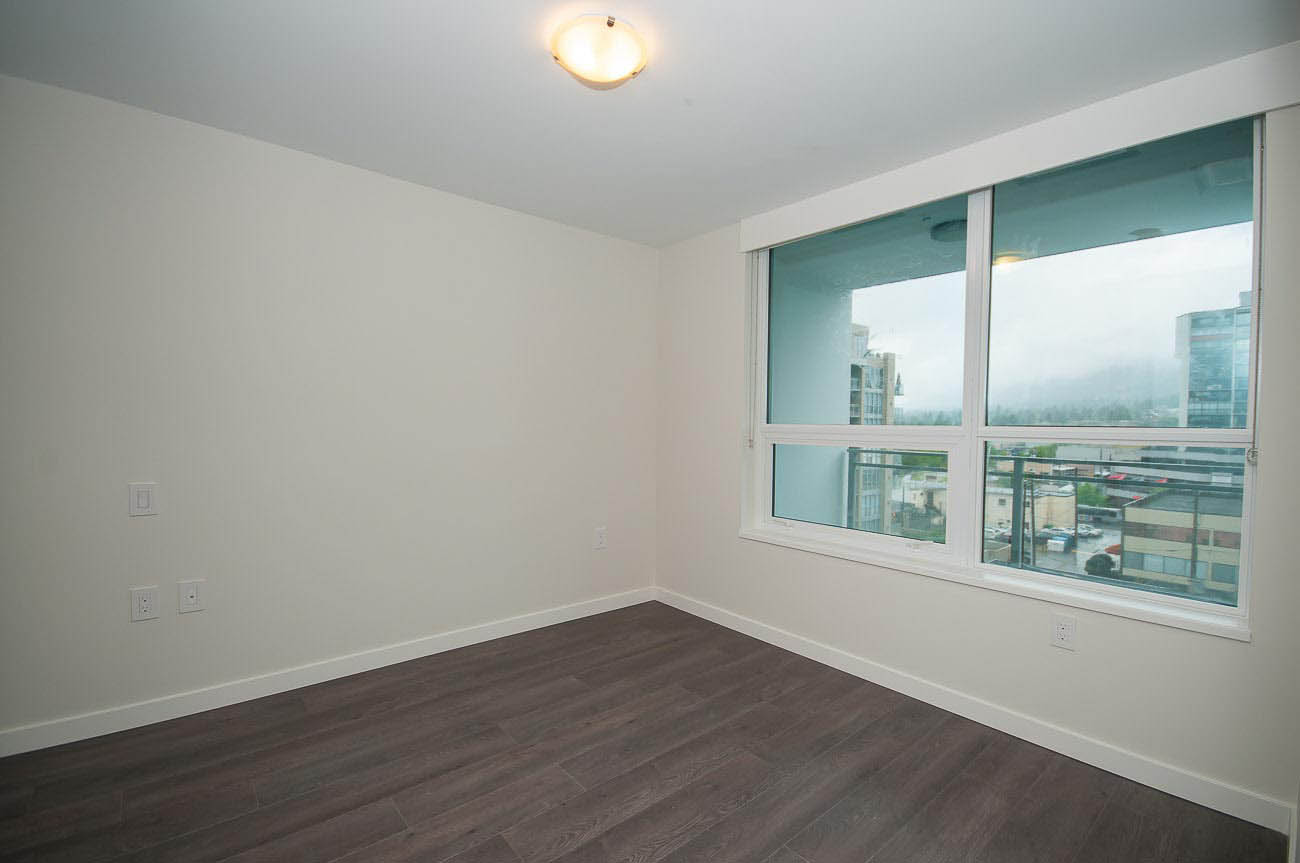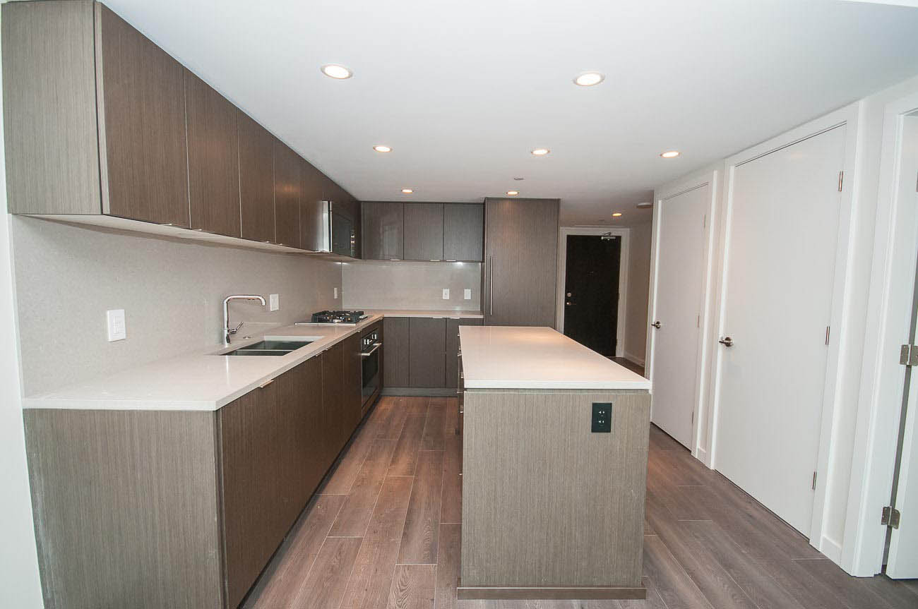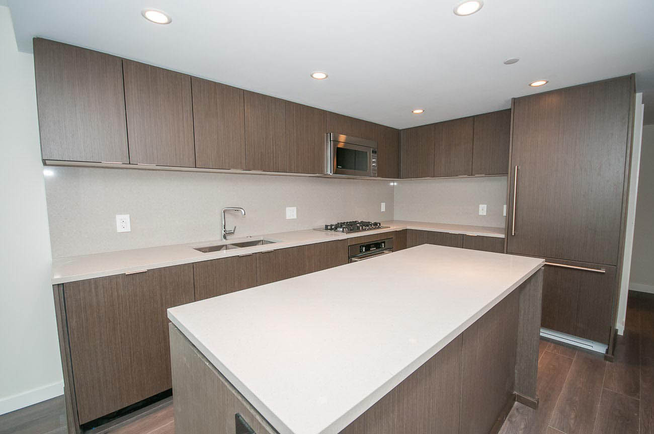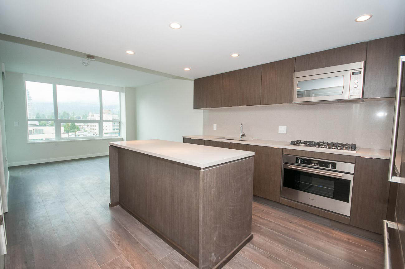 Spacious! Bright! Contemporary! This beautiful 1 bedroom and den condo in CentreView is equipped with an open concept floorplan, gourmet kitchen, and large balcony. The kitchen is functional, efficient and well-appointed with high-end Italian Fulgor Milano and Fhiaba appliances, composite countertops, and a huge island - perfect for meal prep! Beautiful dark laminate flooring spans throughout the main living/dining/kitchen area, and expansive windows let in plenty of natural light. The bathroom offers a peaceful bit of serenity with natural travertine stone flooring NuHeat heated floors, a solid marble countertop, and deep soaker tub for ultimate relaxation. The bedroom is roomy and bright with ample storage. Central A/C, 1 parking, and 1 storage and bike locker included. The location is unbeatable! Situated right on Lonsdale, there's easy access to the highway, downtown and public transit and soon-to-be Whole Foods; not to mention the assortment of restaurants and entertainment Lower Lonsdale boasts is just a few blocks away. State-of-the-art amenities include: landscaped roof terrace, outdoor pool and hot tub, BBQ area, daycare, two guest suites, professionally equipped fitness centre, sauna and steam room, squash court, large party room with kitchen, meeting / media room and games room, dry cleaning services available. FREE CABLE/INTERNET FOR FIRST YEAR - CHOICE OF TELUS OR SHAW.