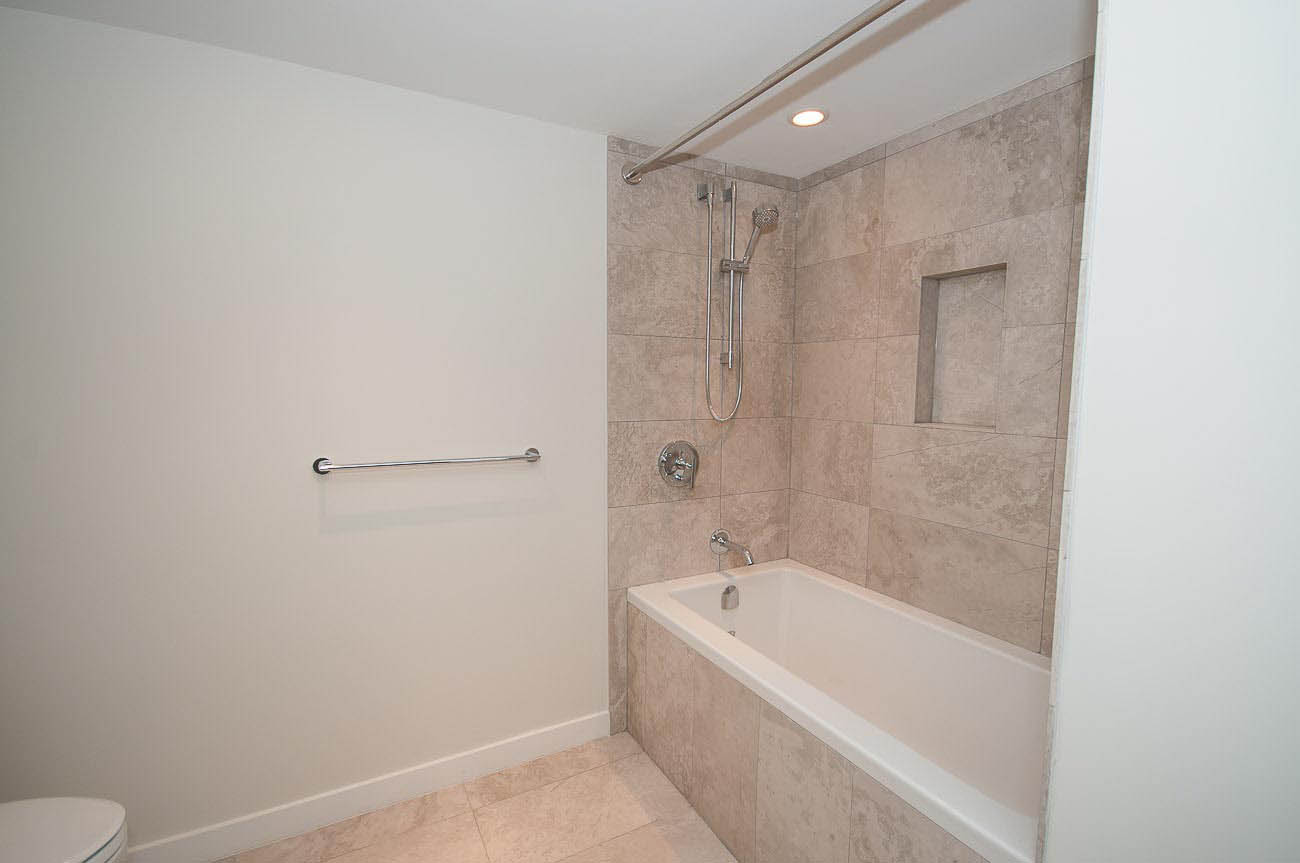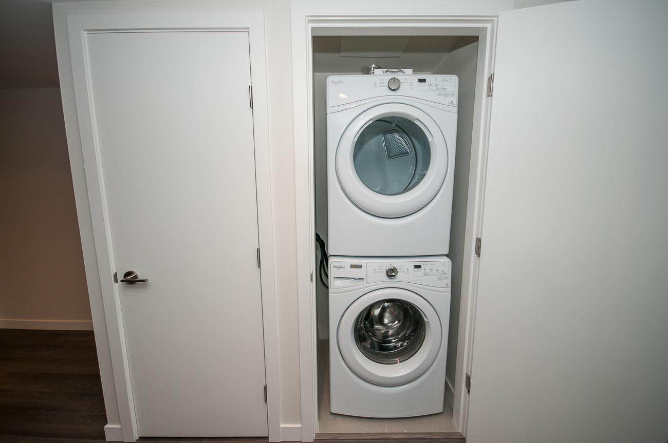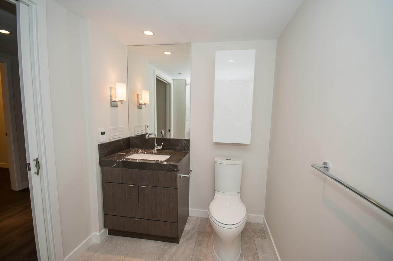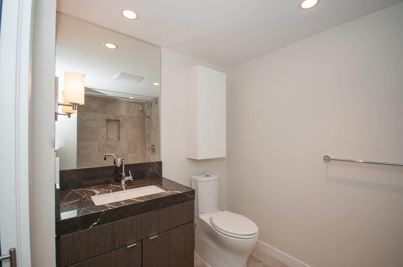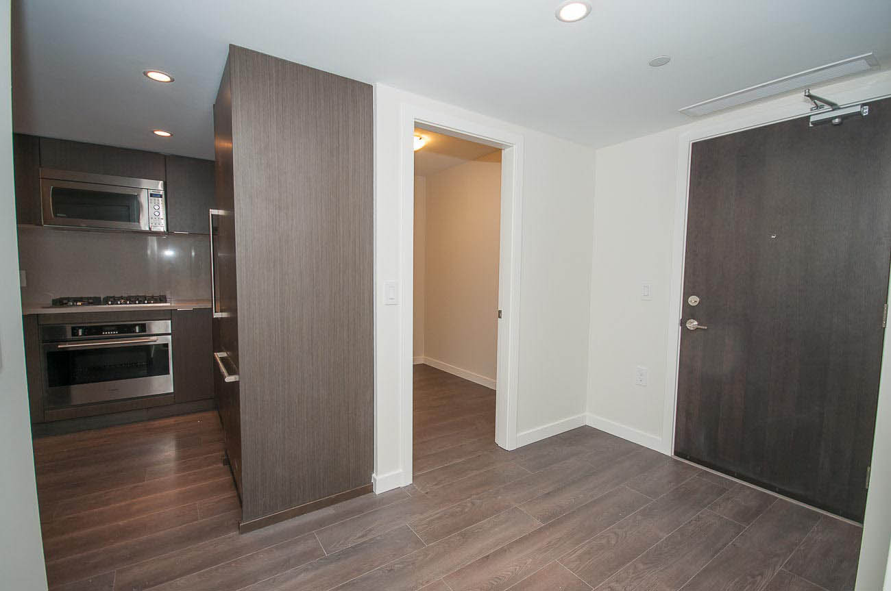 Spacious! Bright! Contemporary! This beautiful 1 bedroom and den condo in CentreView is equipped with an open concept floorplan, gourmet kitchen, and large balcony. The kitchen is functional, efficient and well-appointed with high-end Italian Fulgor Milano and Fhiaba appliances, composite countertops, and a huge island - perfect for meal prep! Beautiful dark laminate flooring spans throughout the main living/dining/kitchen area, and expansive windows let in plenty of natural light. The bathroom offers a peaceful bit of serenity with natural travertine stone flooring NuHeat heated floors, a solid marble countertop, and deep soaker tub for ultimate relaxation. The bedroom is roomy and bright with ample storage. Central A/C, 1 parking, and 1 storage and bike locker included. The location is unbeatable! Situated right on Lonsdale, there's easy access to the highway, downtown and public transit and soon-to-be Whole Foods; not to mention the assortment of restaurants and entertainment Lower Lonsdale boasts is just a few blocks away. State-of-the-art amenities include: landscaped roof terrace, outdoor pool and hot tub, BBQ area, daycare, two guest suites, professionally equipped fitness centre, sauna and steam room, squash court, large party room with kitchen, meeting / media room and games room, dry cleaning services available. FREE CABLE/INTERNET FOR FIRST YEAR - CHOICE OF TELUS OR SHAW.