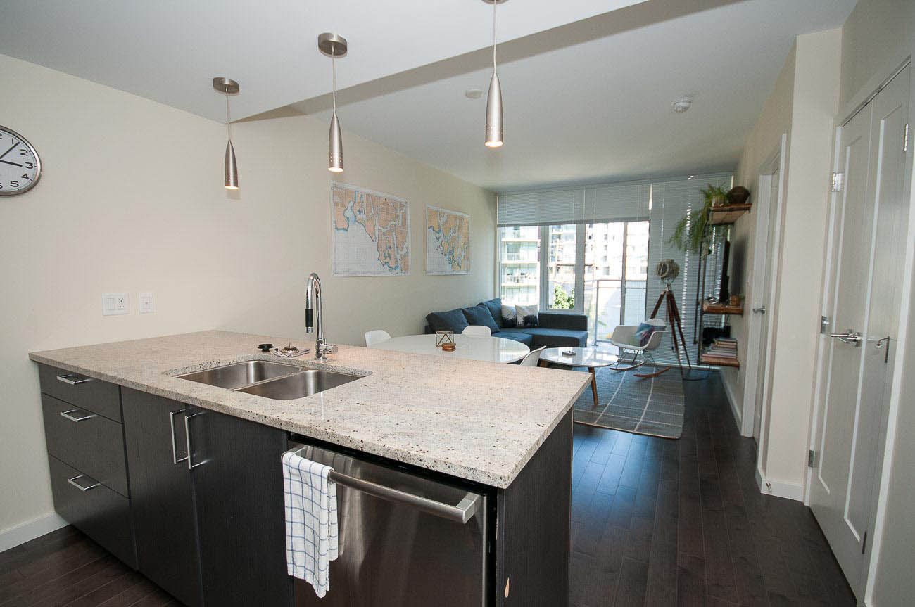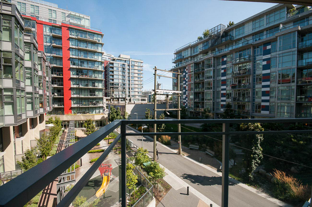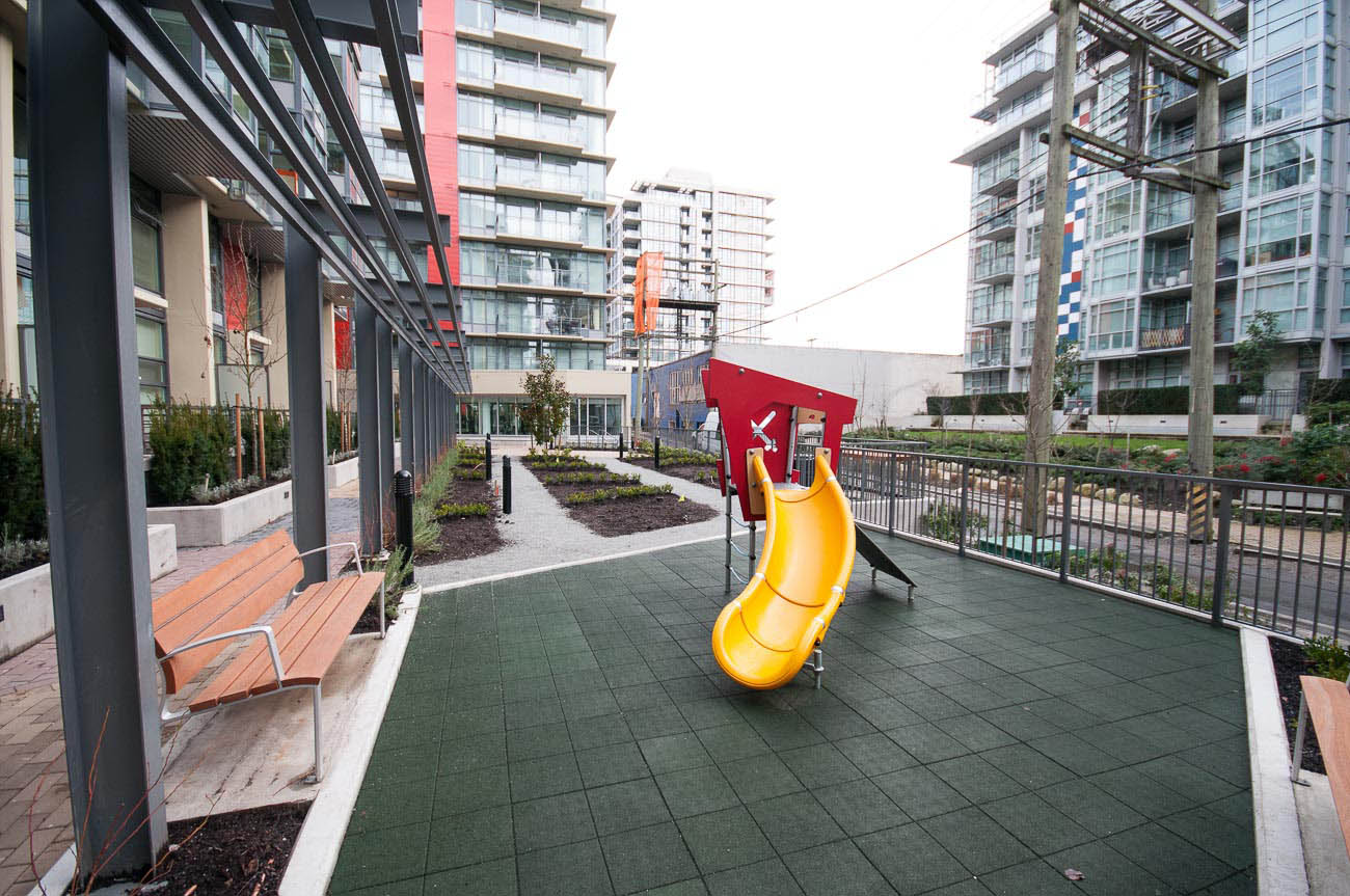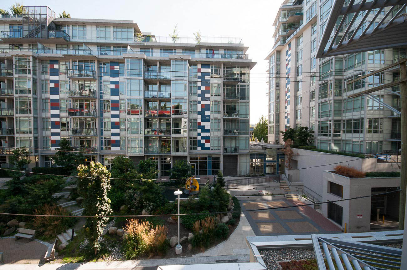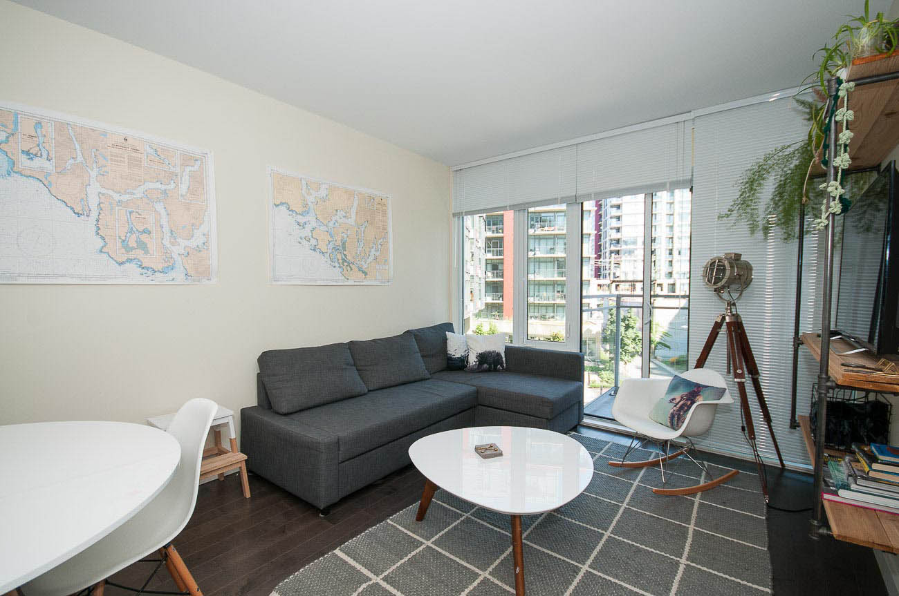 Beautiful! Modern! Spacious! This open concept, contemporary condo in False Creek is smartly designed with a spacious kitchen, big windows to let in plenty of natural light, a large bedroom and built-in air conditioning. The gourmet kitchen features stainless steel appliances including gas stovetop, ample storage, granite countertops, and a trendy blue glass backsplash. Beautiful dark engineered hardwood flooring extends from the kitchen throughout the dining and living areas to create a cohesive modern feel. The roomy bedroom features plush carpeting and large closets, while the bathroom is functional and stylish. Above all, it's all about location, location, location! This cool neighbourhood boasts some of the city's best craft breweries, restaurants, shopping and more. Plus it's just steps from the False Creek seawall with easy access to downtown Vancouver, the Canada Line and public transit. Enjoy the resort style amenities including a fully equipped fitness centre, rooftop infinity pool and hot tub. 1 parking stall included.