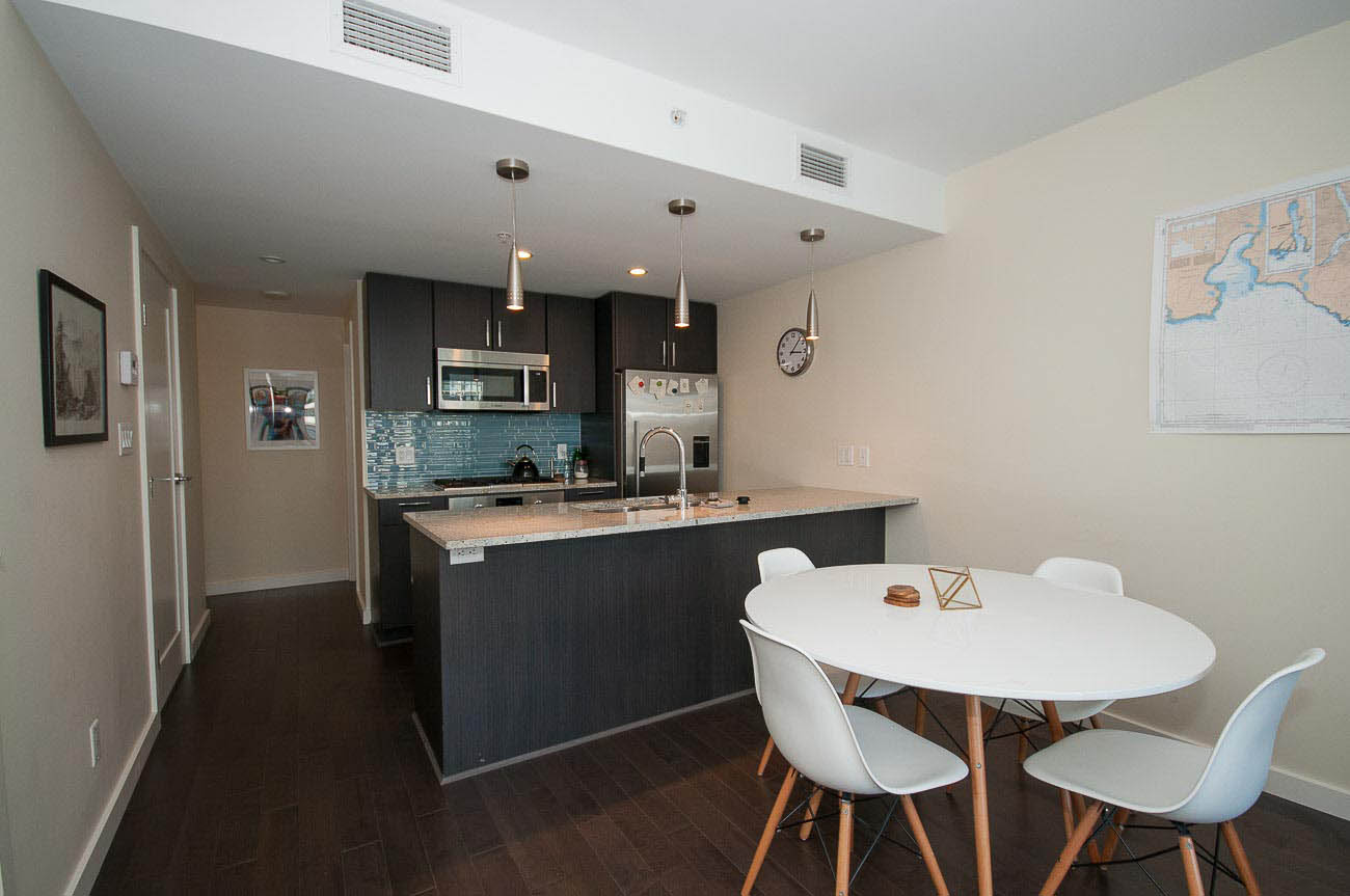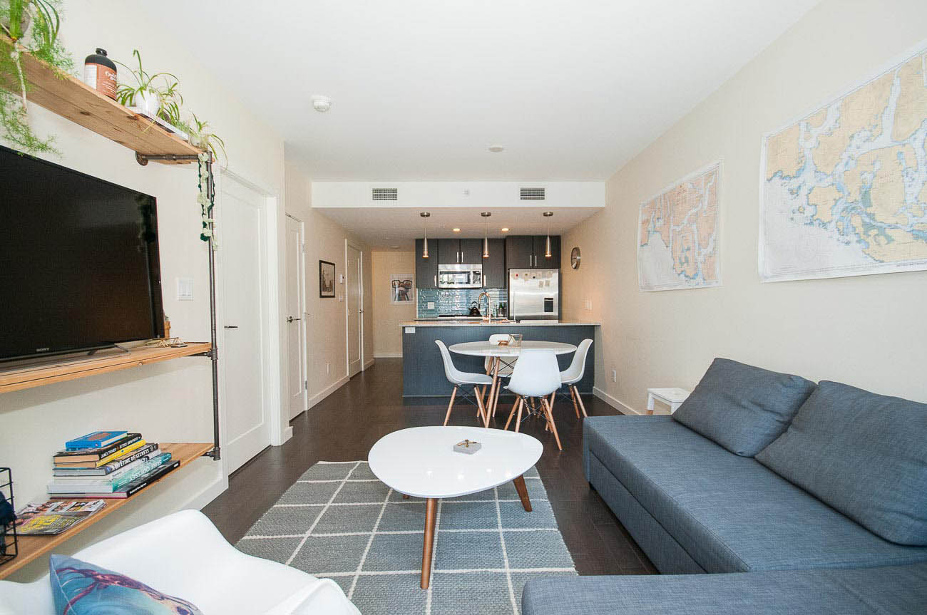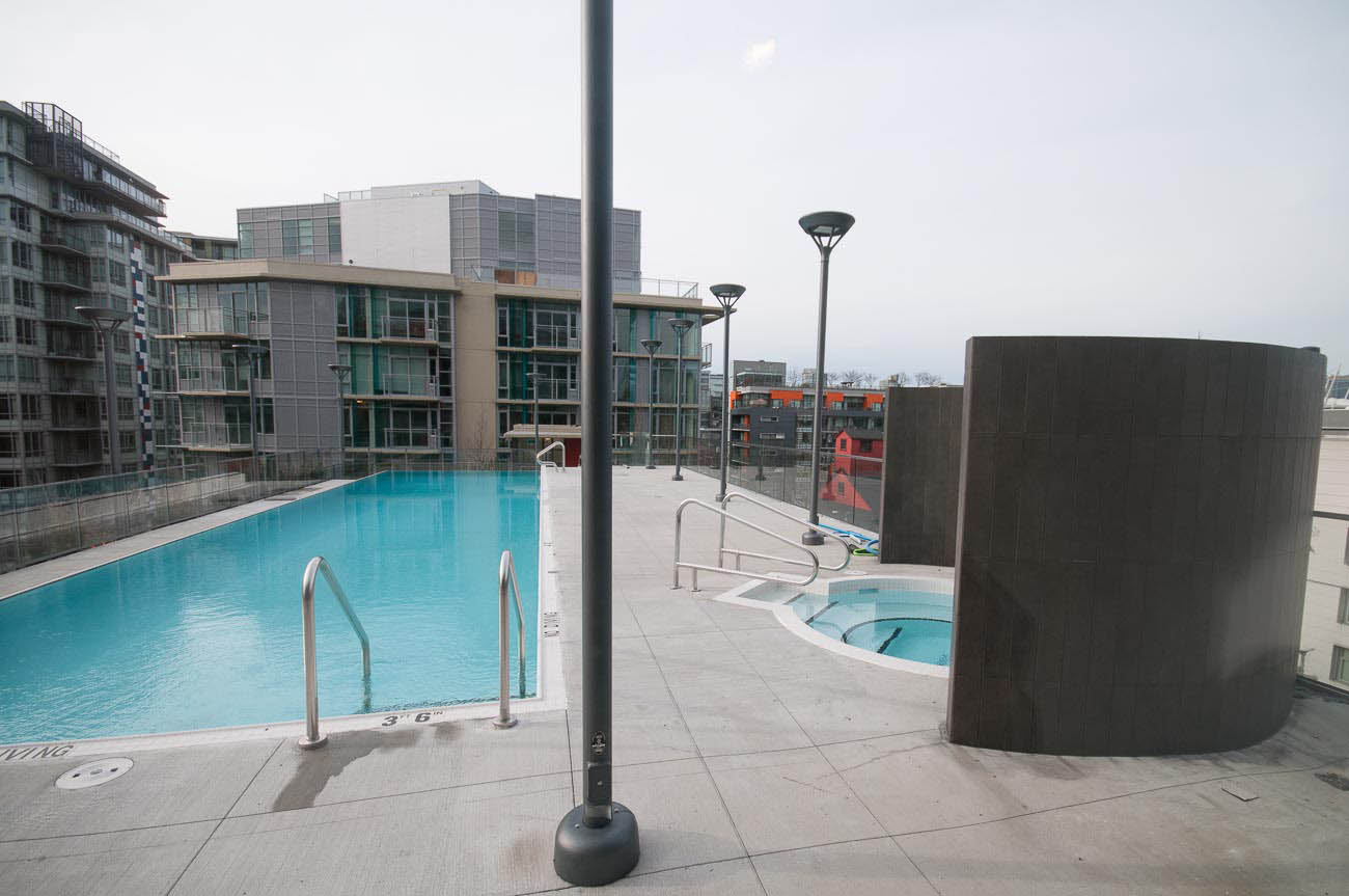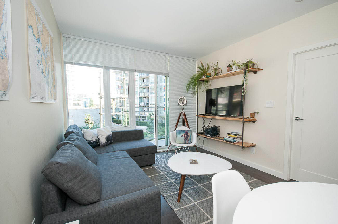 Beautiful! Modern! Spacious! This open concept, contemporary condo in False Creek is smartly designed with a spacious kitchen, big windows to let in plenty of natural light, a large bedroom and built-in air conditioning. The gourmet kitchen features stainless steel appliances including gas stovetop, ample storage, granite countertops, and a trendy blue glass backsplash. Beautiful dark engineered hardwood flooring extends from the kitchen throughout the dining and living areas to create a cohesive modern feel. The roomy bedroom features plush carpeting and large closets, while the bathroom is functional and stylish. Above all, it's all about location, location, location! This cool neighbourhood boasts some of the city's best craft breweries, restaurants, shopping and more. Plus it's just steps from the False Creek seawall with easy access to downtown Vancouver, the Canada Line and public transit. Enjoy the resort style amenities including a fully equipped fitness centre, rooftop infinity pool and hot tub. 1 parking stall included.
