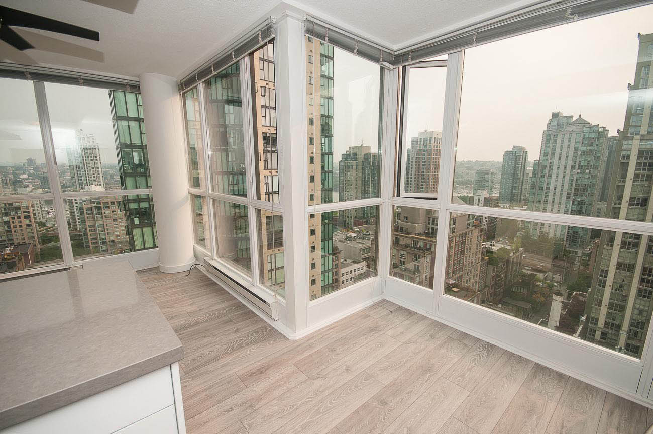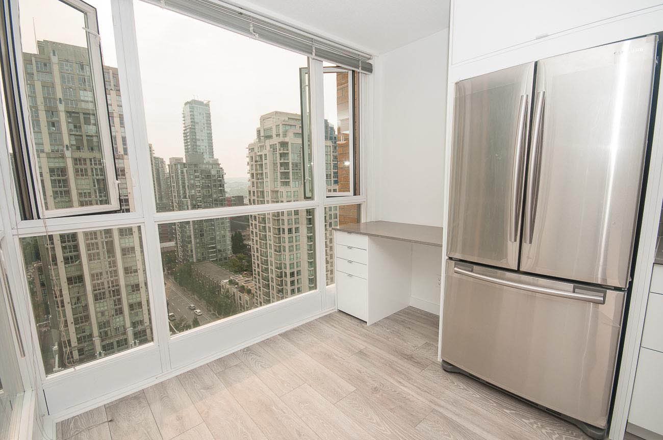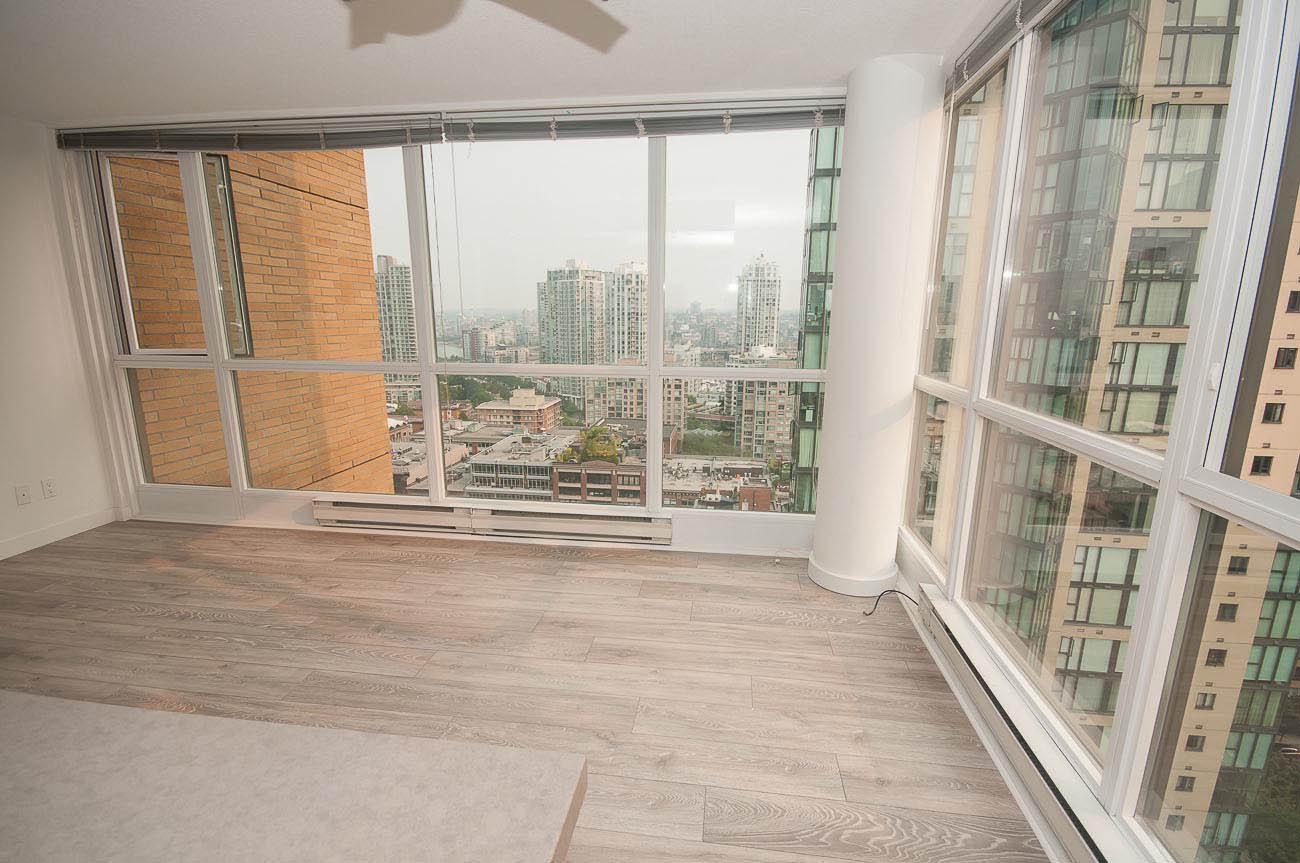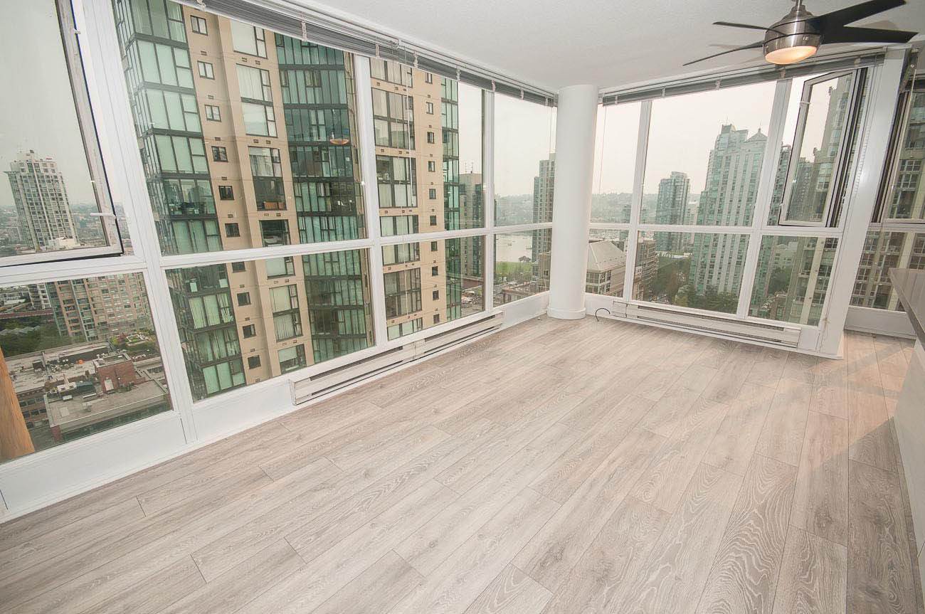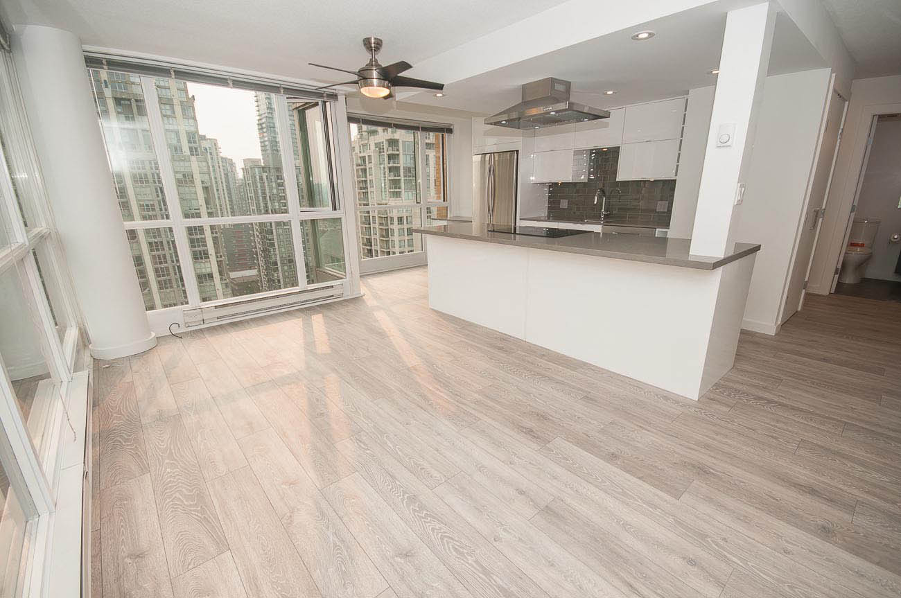 Beautiful, bright and modern one bedroom and den corner unit with 180 degree views of False Creek on the 20th floor! Custom built renovation with brand new laminate flooring, new quartz countertops in kitchen and bathroom, new appliances, high end new cabinets, and mirrored closets. 650 square feet with functional open floor plan. Great location in the heart of downtown Yaletown steps to entertainment, fine dining, shopping, parks, bus and SkyTrain. Prime Yaletown location across from Emery Barnes Park and Choices Market grocery. Three blocks to Seawall and Yaletown Roundhouse SkyTrain, Canada Line. Rarely available unit. 1 parking stall included and Bike storage available in the building. Well equipped gym and sauna with outdooor yoga! Lovely common area Courtyard that is a great space to relax and read a book.