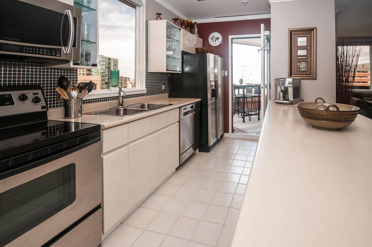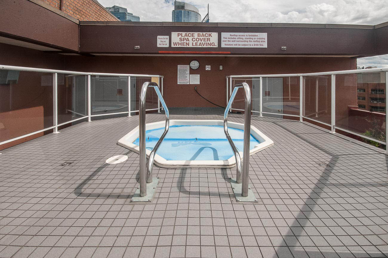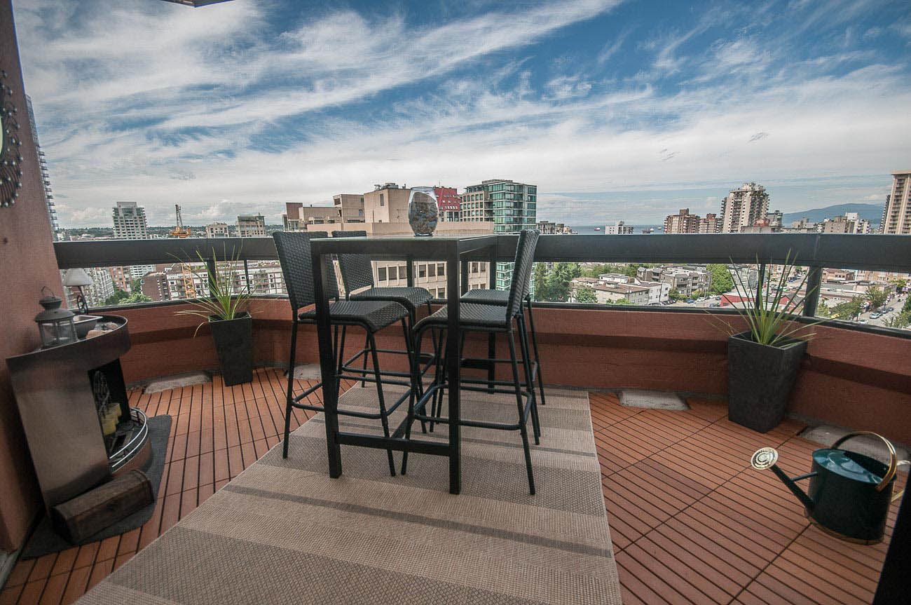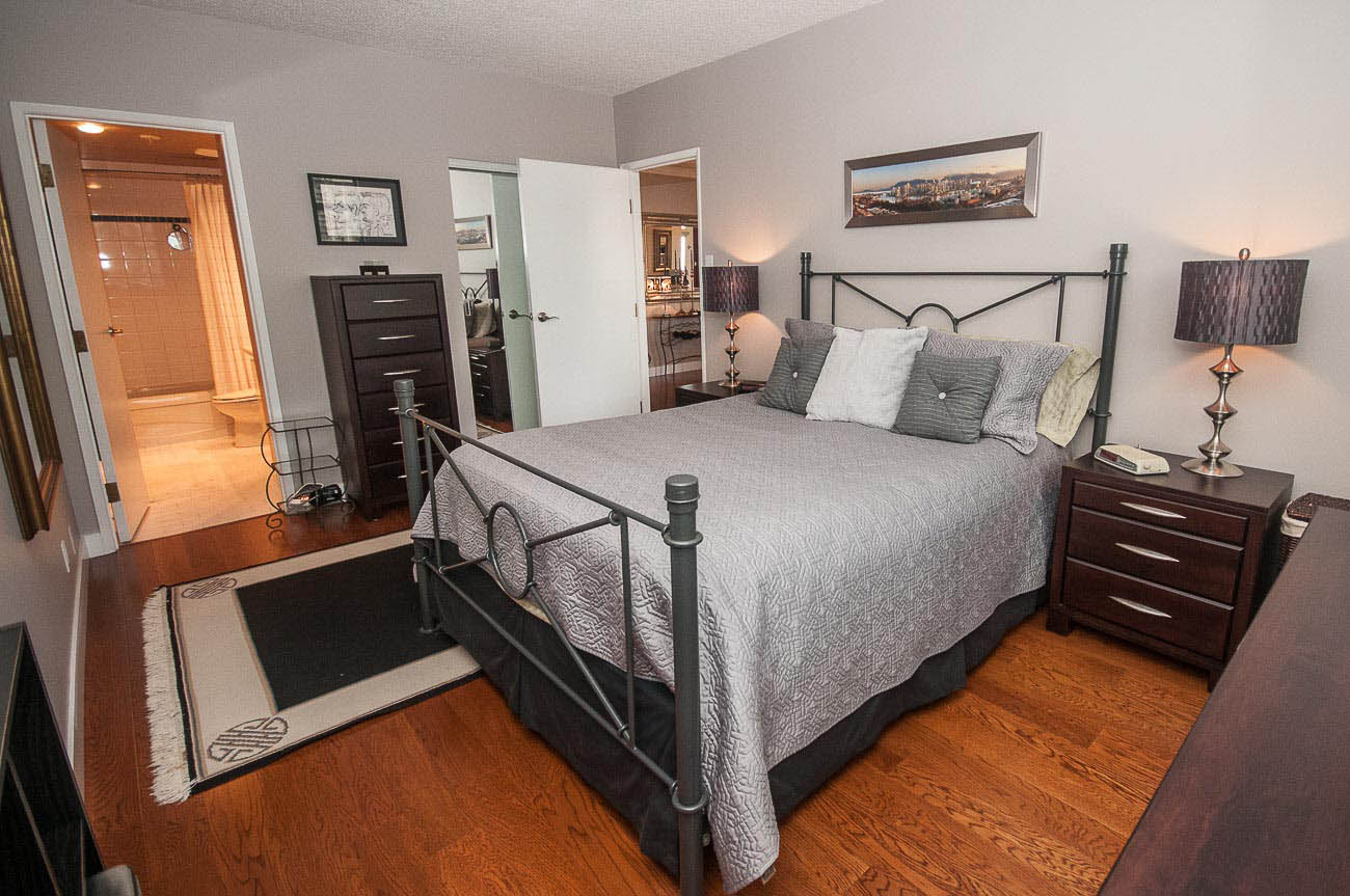View Sub-penthouse! Spacious amazing sub-penthouse in Downtown Core. The unit features 1118 sf of living space, 2 large bedrooms, and 2 bathrooms. Many updates including engineered hardwood floor and stainless steel appliances. Open concept kitchen for cooking and entertainment. Balconies are joined by a wraparound walkway connecting living, dining and one of the bedrooms and expanding the great SW water and mountain views. Bedrooms are on opposite sides of apartment. The building provides, beautiful Rooftop amenities, gym, hot tub, and steam room. A party room with pool table is also part of this great building. HEAT, HOT WATER, 1 parking stall, and 1 storage locker included.