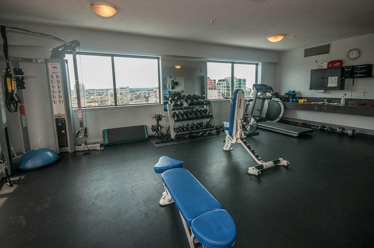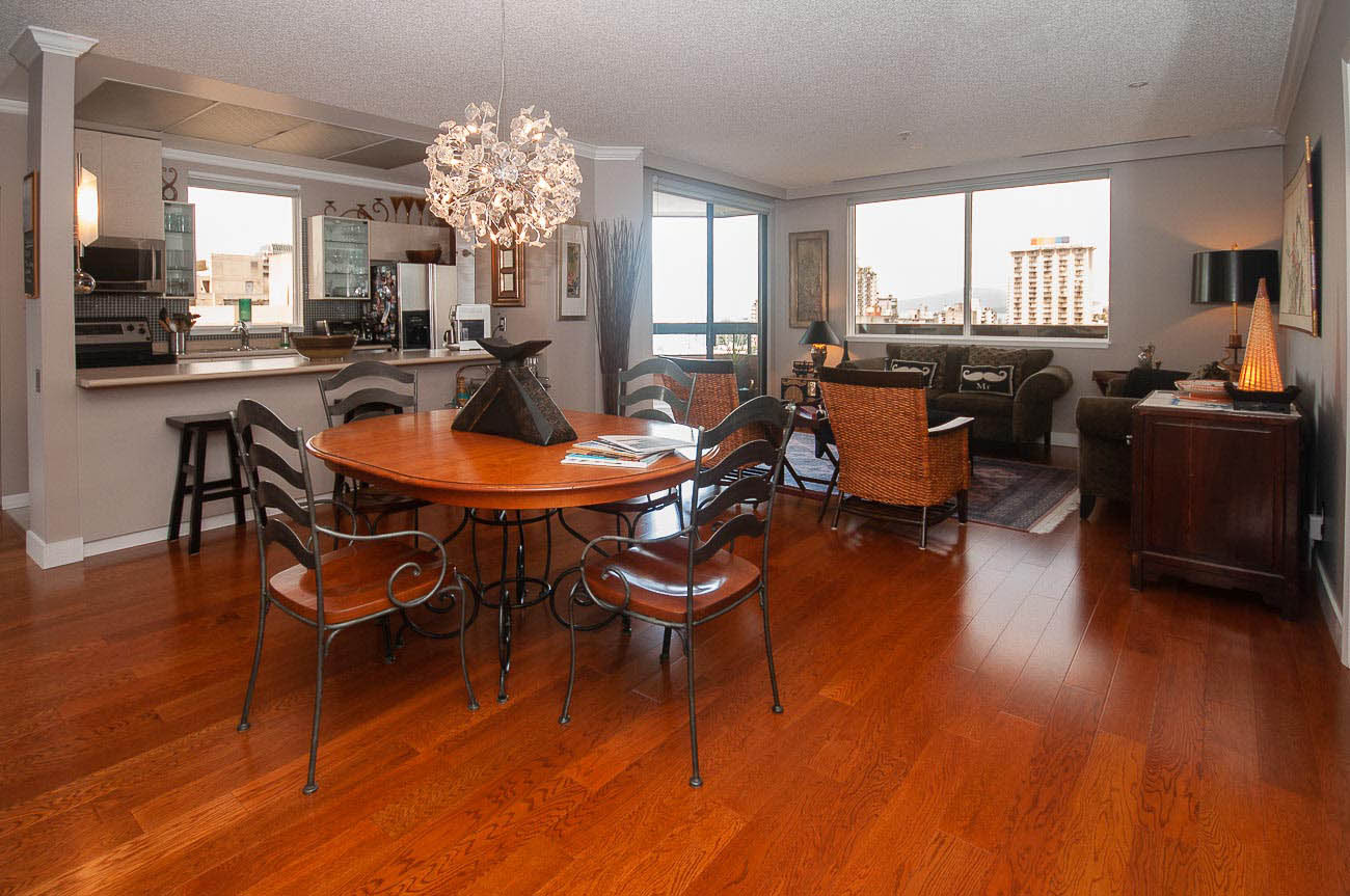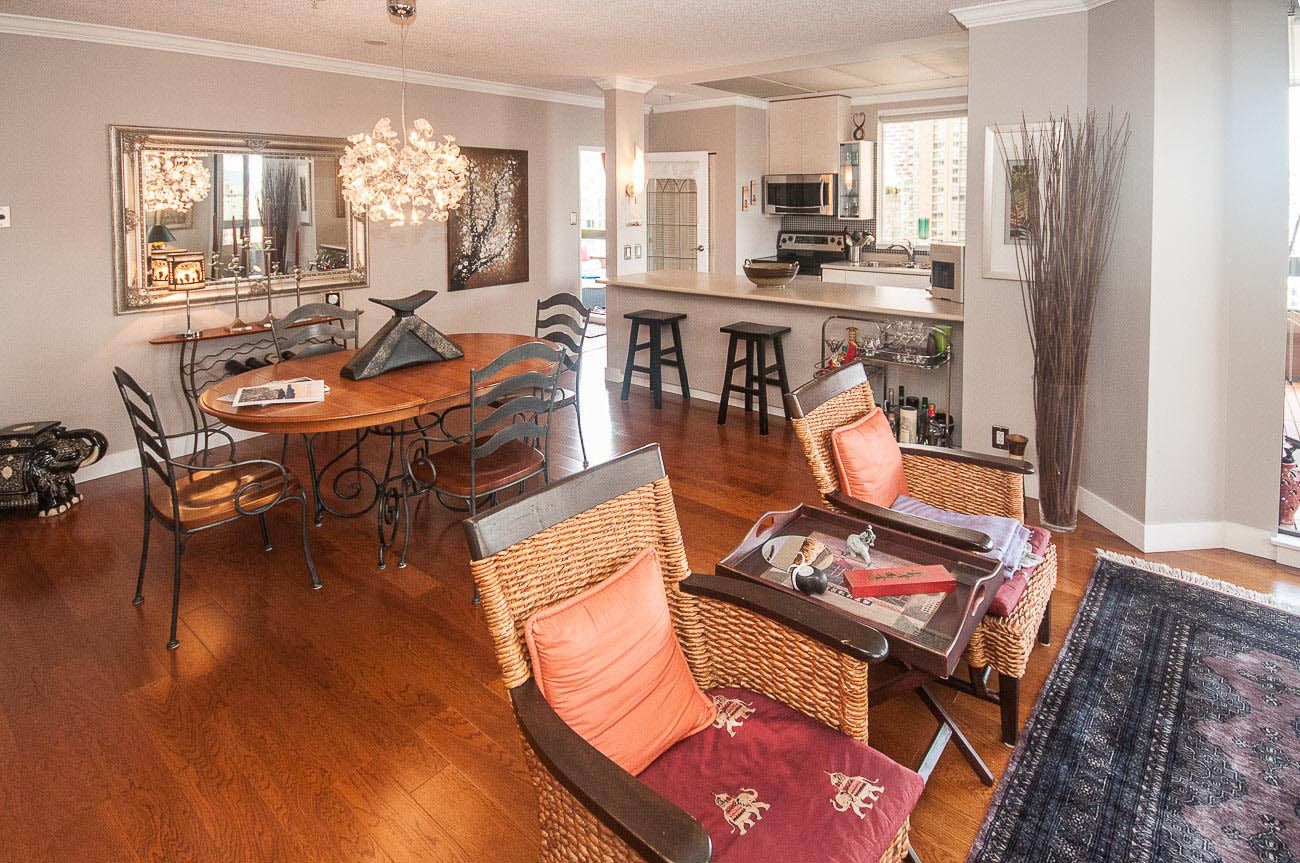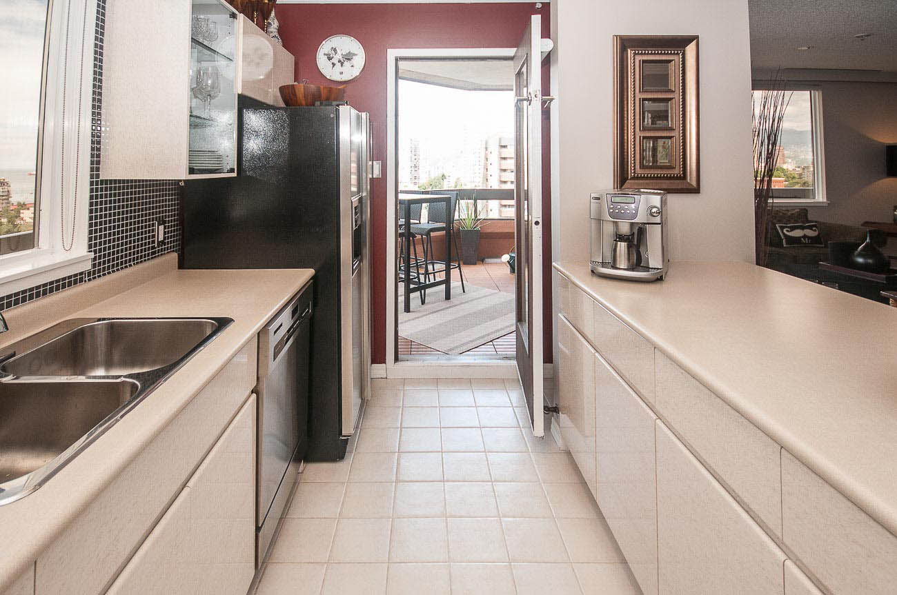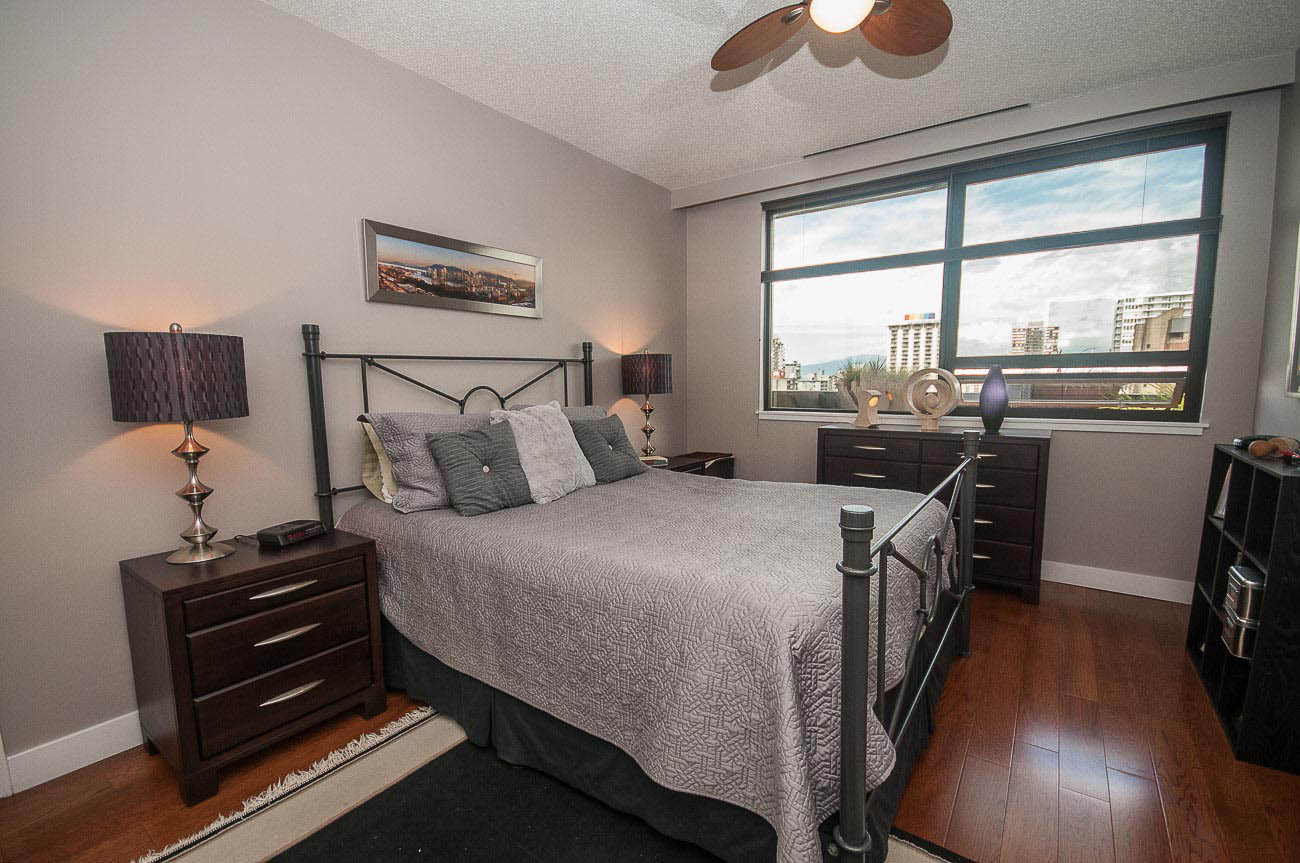 View Sub-penthouse! Spacious amazing sub-penthouse in Downtown Core. The unit features 1118 sf of living space, 2 large bedrooms, and 2 bathrooms. Many updates including engineered hardwood floor and stainless steel appliances. Open concept kitchen for cooking and entertainment. Balconies are joined by a wraparound walkway connecting living, dining and one of the bedrooms and expanding the great SW water and mountain views. Bedrooms are on opposite sides of apartment. The building provides, beautiful Rooftop amenities, gym, hot tub, and steam room. A party room with pool table is also part of this great building. HEAT, HOT WATER, 1 parking stall, and 1 storage locker included.
