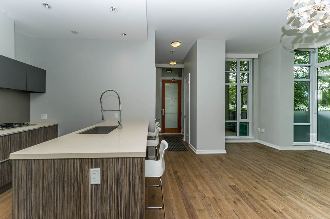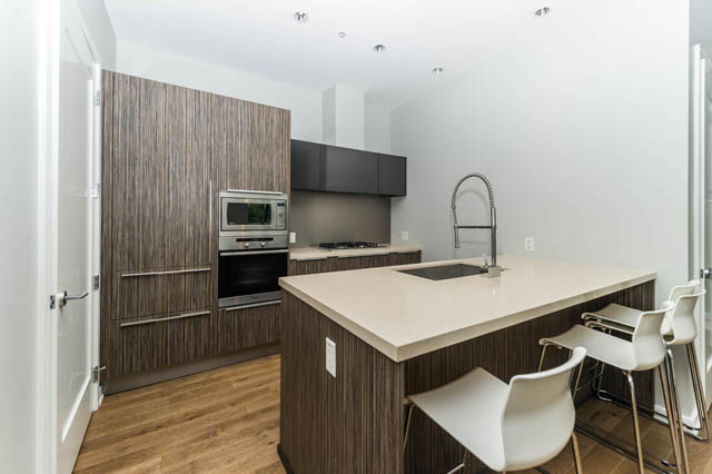 This corner townhome has a beautiful light like feel with 10' ceilings and floor to ceiling windows. This 2 bed + den unit features 2 patio spaces, and a street-level walkout entrance. Open-concpet kitchen, living, and dining area. German imported kitchen Eggersman cabinetry & built in Miele appliances includes a gas range, oven, dishwasher and Sub-Zero fridge. Kayak has two lounges to reserve for your enjoyment and its own fitness centre and 3rd floor garden. Also access to first class amenities at the Gold Medal Club with an indoor pool & a fitness centre. Steps away from great restaurants, shops, the Seawall as well as easy access to the Canada/Expo Lines. A home and lifestyle anyone can enjoy. 1 parking stall and bike storage for 2 bikes included.