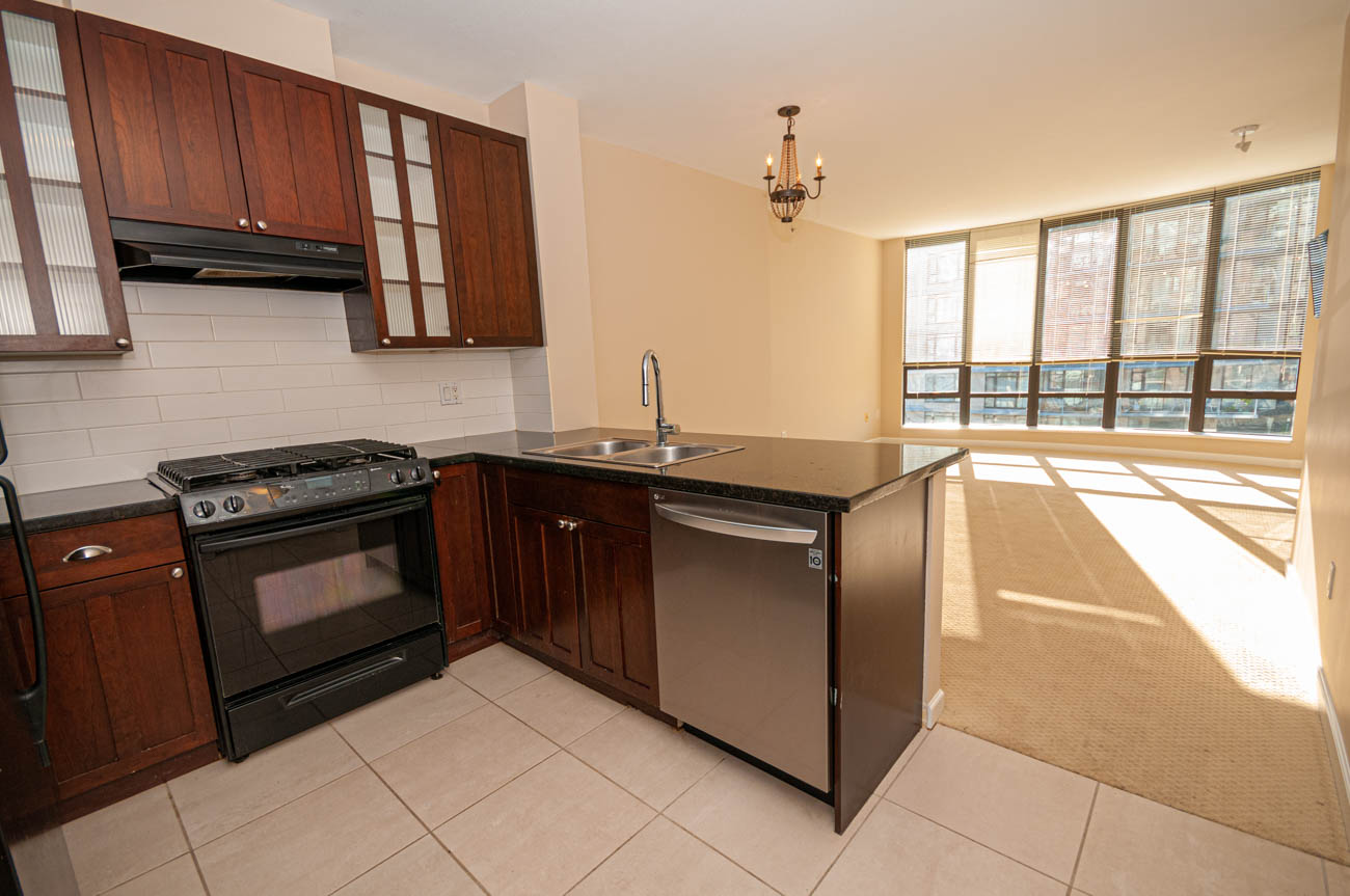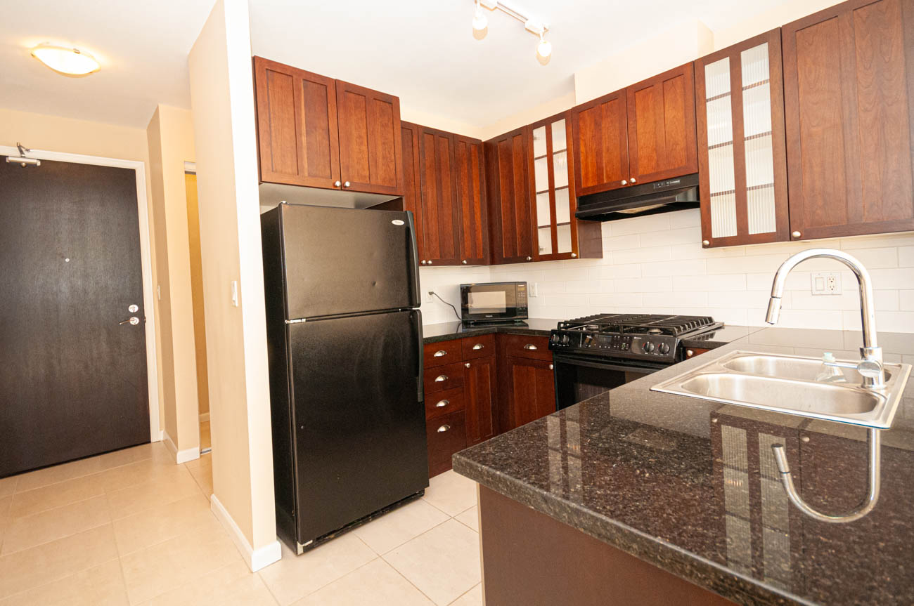 Southwest water and Lions Gate Bridge views all the way to the North Shore Mountains! Plenty of natural light in this immaculate 735 sqft, 1 bedroom at One Park Lane! The "05" modern open concept plan features a very wide living room, high South facing bay windows and 2 access doors to the covered view balcony. Kitchen boasts dark wood cabinets and granite tops. Bedroom openly connects bathroom. Insuite laundry closet room. Gas fireplace. Neutral paint has rejuvenated all walls, doors, baseboards and ceilings! 1 Parking/1 BIG LOCKER. Park Lane has a New York City flare w/a concierge, gym, party/movie rooms. PRIME LOLO LOCATION in the heart of the city pulse! Heat, gas and hot water is included with the rent.
