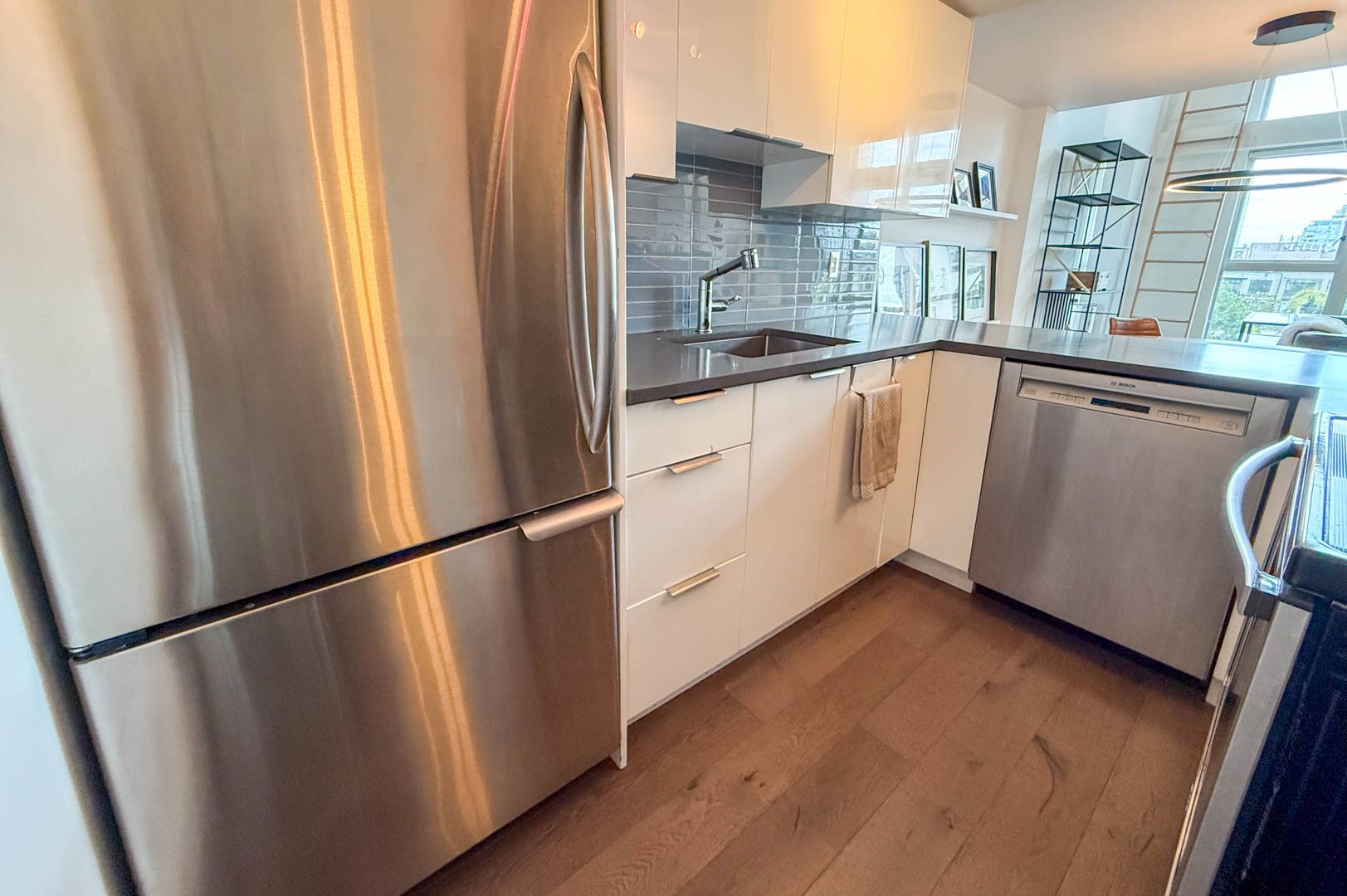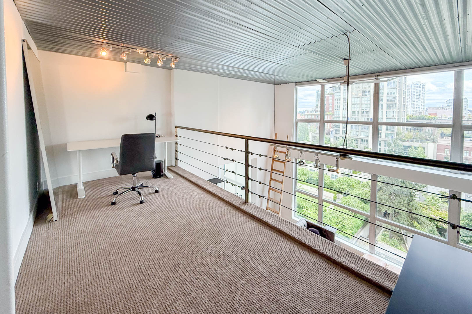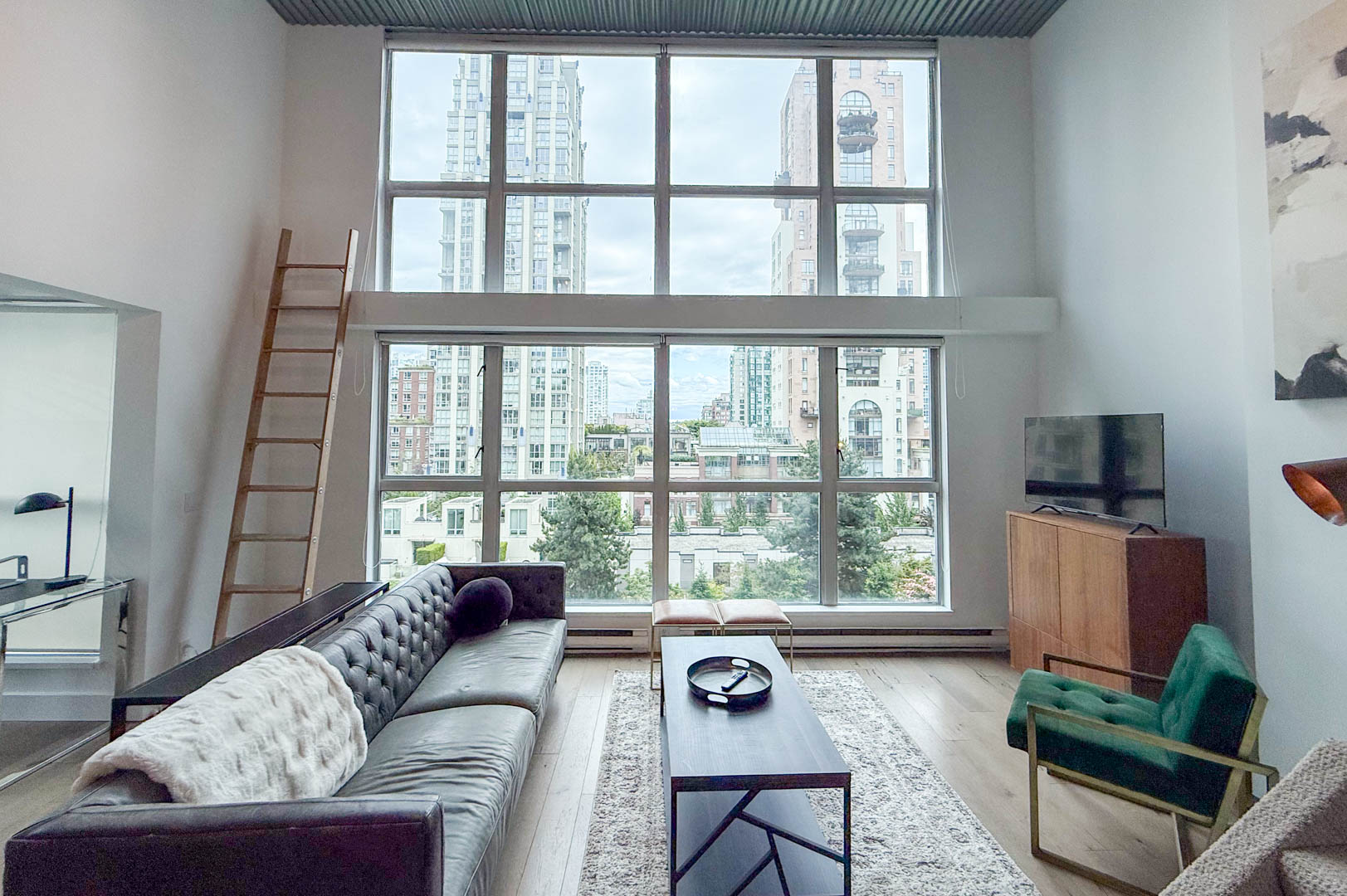 This one-of-a-kind, 994 sq. ft. architecturally designed New York-style loft has been extensively renovated from top to bottom. One of only a few homes featuring a city-approved legal loft addition, it has been thoughtfully designed to maximize natural light, functionality, flow, and storage. The upper level offers a spacious primary bedroom with a large adjoining den ideal for working from home. On the main level, soaring 15-foot windows flood the open-concept living space with light and provide picturesque views over surrounding low-rise buildings, ensuring exceptional privacy. Additional features include engineered hardwood flooring, a fully enclosed laundry/storage room, a newly renovated kitchen and bathroom with Caesarstone countertops, Cantu fixtures, Bosch appliances, and new blinds. Step outside to your private 185 sq. ft. patio, which opens onto a rarely used 2,000 sq. ft. communal deck, perfect for summer BBQs and relaxing outdoors. Located in the sought-after neighbourhood of Yaletown, enjoy being just steps from great restaurants, shopping, nightlife and more! 1 secure parking stall, 1 storage locker, and utilities are included with rent.
