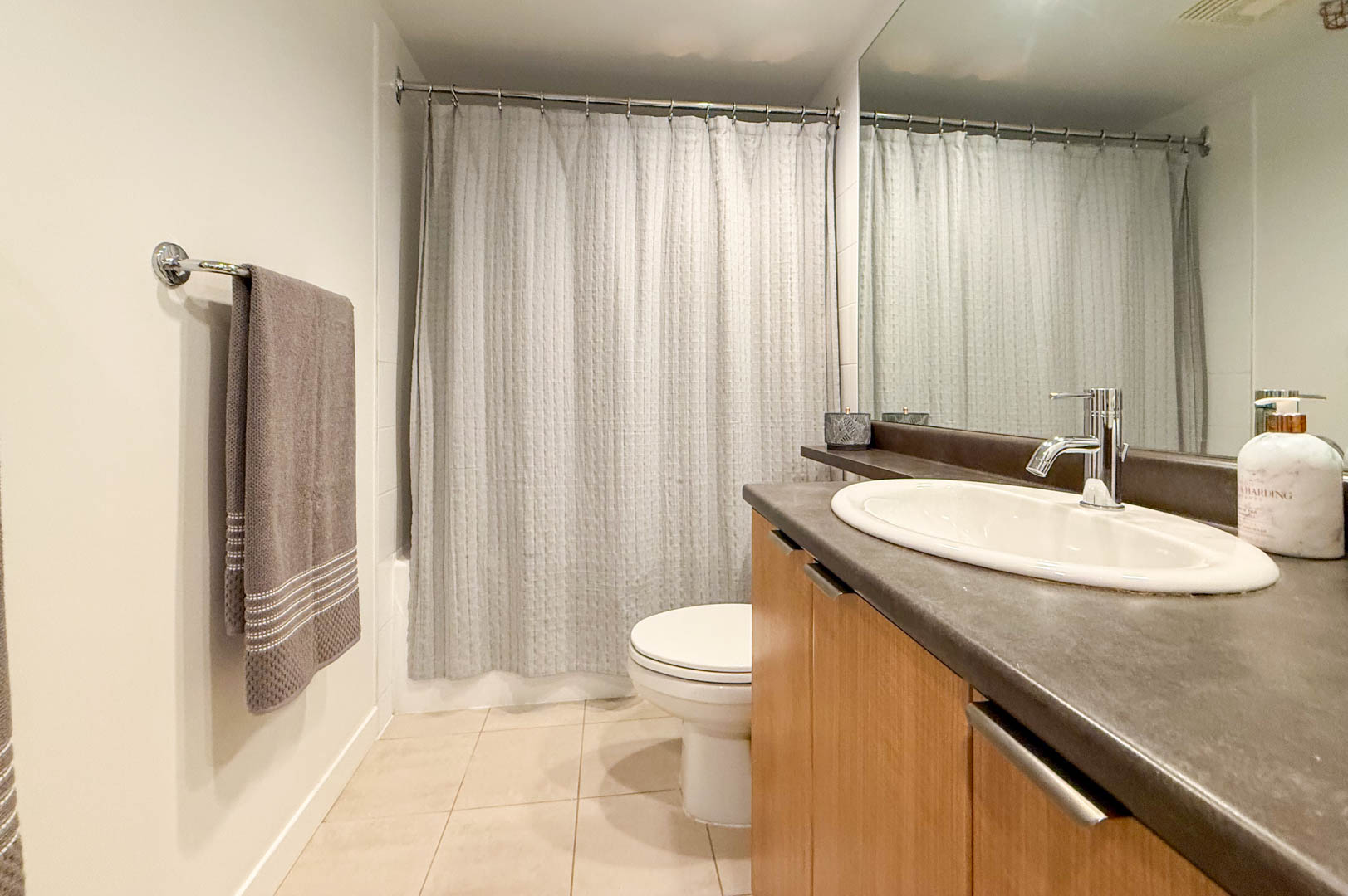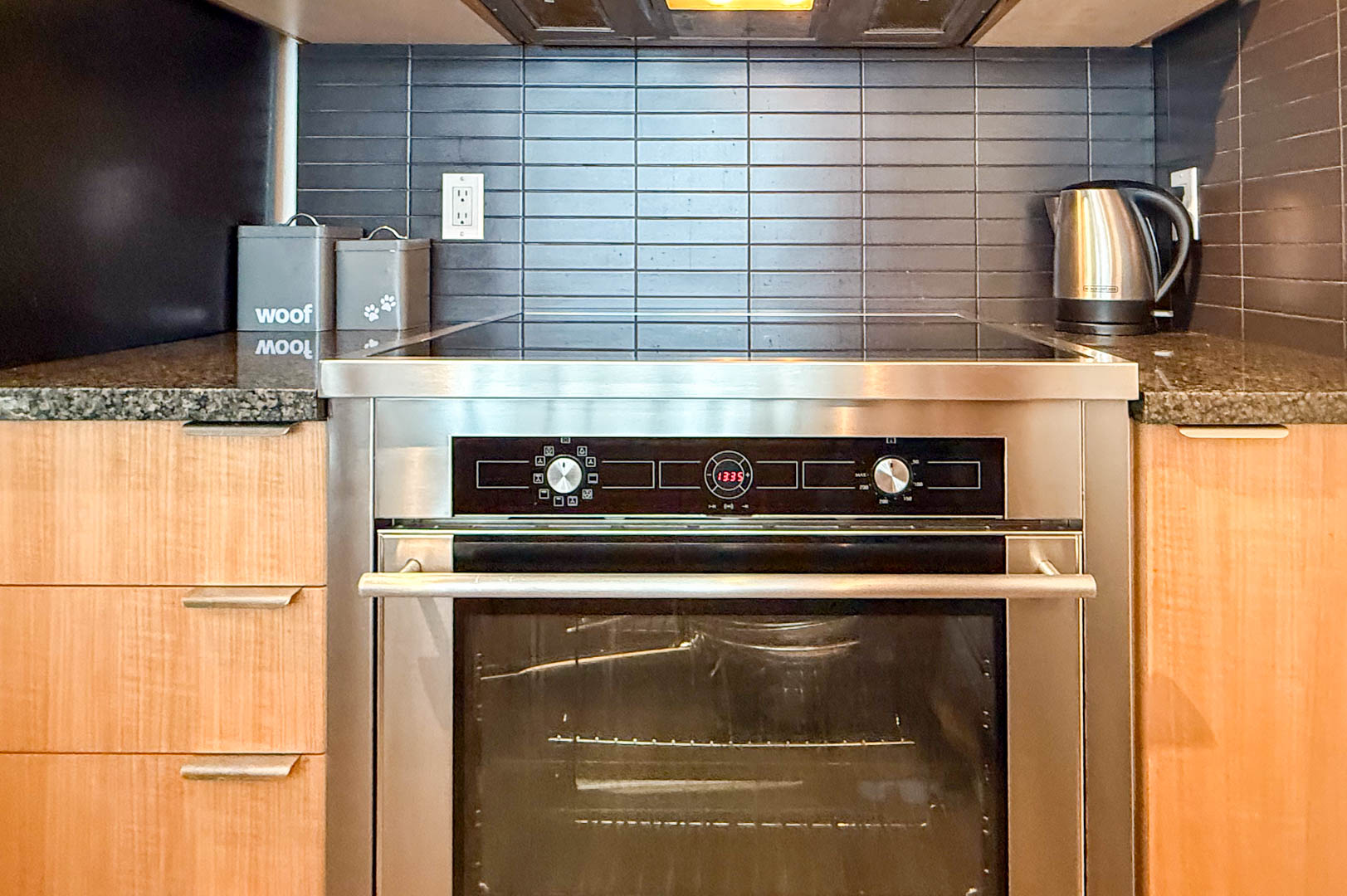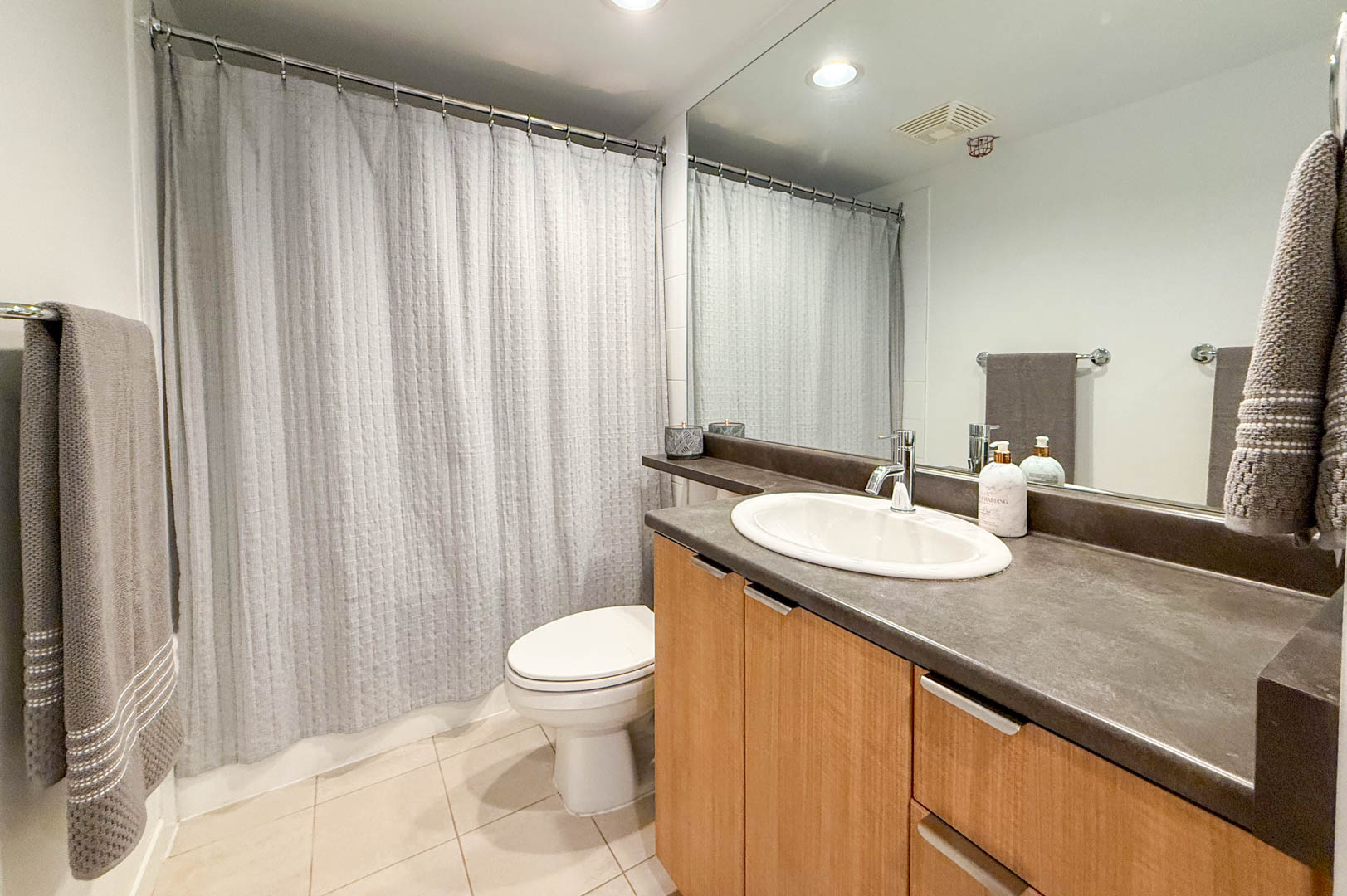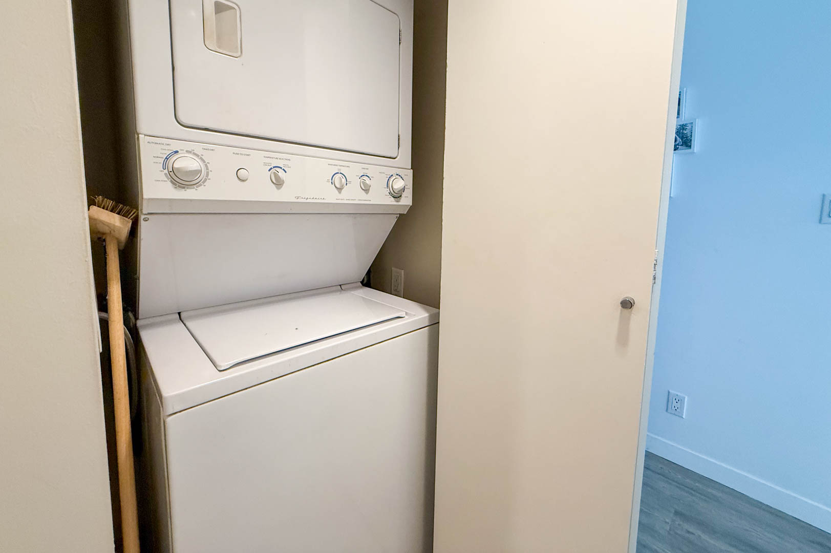 This UNFURNISHED efficient open-concept 550 sq.ft. 1-bdrm + office/den, 1-bath condo offers a well-planned layout for maximum comfort and livability. The bedroom includes generous built-in storage, a walk-in closet with custom cabinetry, and fits a queen size bed. The custom cabinet on one side can be removed to accommodate a king-sized bed if preferred. The kitchen features granite countertops, stainless steel appliances with an easy-to-use induction cooktop, a built-in microwave with hood fan, and dishwasher. Easy-to-maintain hard-surface flooring flows throughout, complemented by in-suite laundry and a spacious balcony off the living room with a peaceful treed outlook.