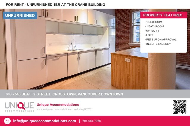 This unfurnished loft in Crosstown, Vancouver Downtown offers 1 bedroom, 1 bathroom, and 671 square feet of living space. Located in The Crane Building. Amenities include parking, in-suite laundry. This property is pet-friendly. Available February 1, 2027. Monthly rent is $2,250. Located at 308 - 546 Beatty Street, Vancouver Downtown. Contact Unique Accommodations at 604-984-7368 to arrange a viewing.