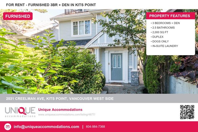 This welcoming family home 3 bdrm + office, 2.5 bath duplex offers 2,000 sq. ft. of warm, elegant living in the heart of Kits Point, one of Vancouver’s most iconic and sought-after neighborhoods. Just steps from Kits Beach and the seawall, this home places you in a vibrant coastal community known for its natural beauty, walkability, and relaxed west coast lifestyle.