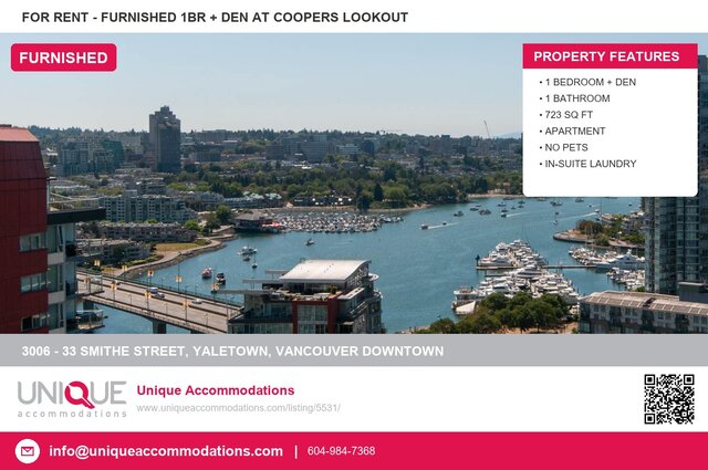 This furnished condo in Yaletown, Vancouver Downtown offers 1 bedroom, 1 bathroom plus a den, and 723 square feet of living space. Located in Coopers Lookout. Amenities include parking, in-suite laundry. Available March 1, 2027. Monthly rent is $3,650. Located at 3006 - 33 Smithe Street, Vancouver Downtown. Contact Unique Accommodations at 604-984-7368 to arrange a viewing.